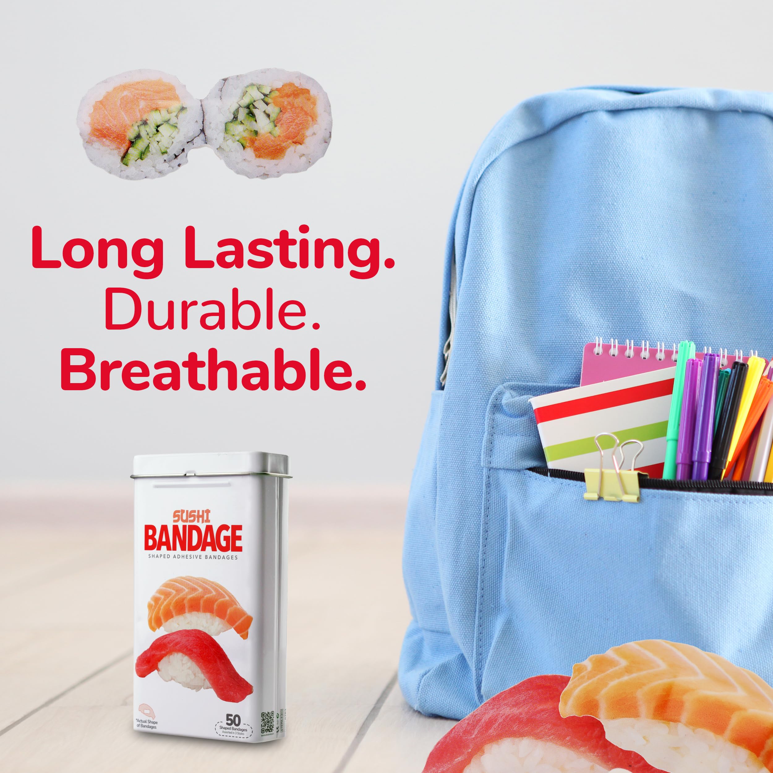 50 SUSHI KIDS BANDAGES: Fun sushi-shaped adhesive bandages tin helps protect cuts, scrapes, and minor wounds while making healing less stressful for children; bandages come in 3 assorted styles