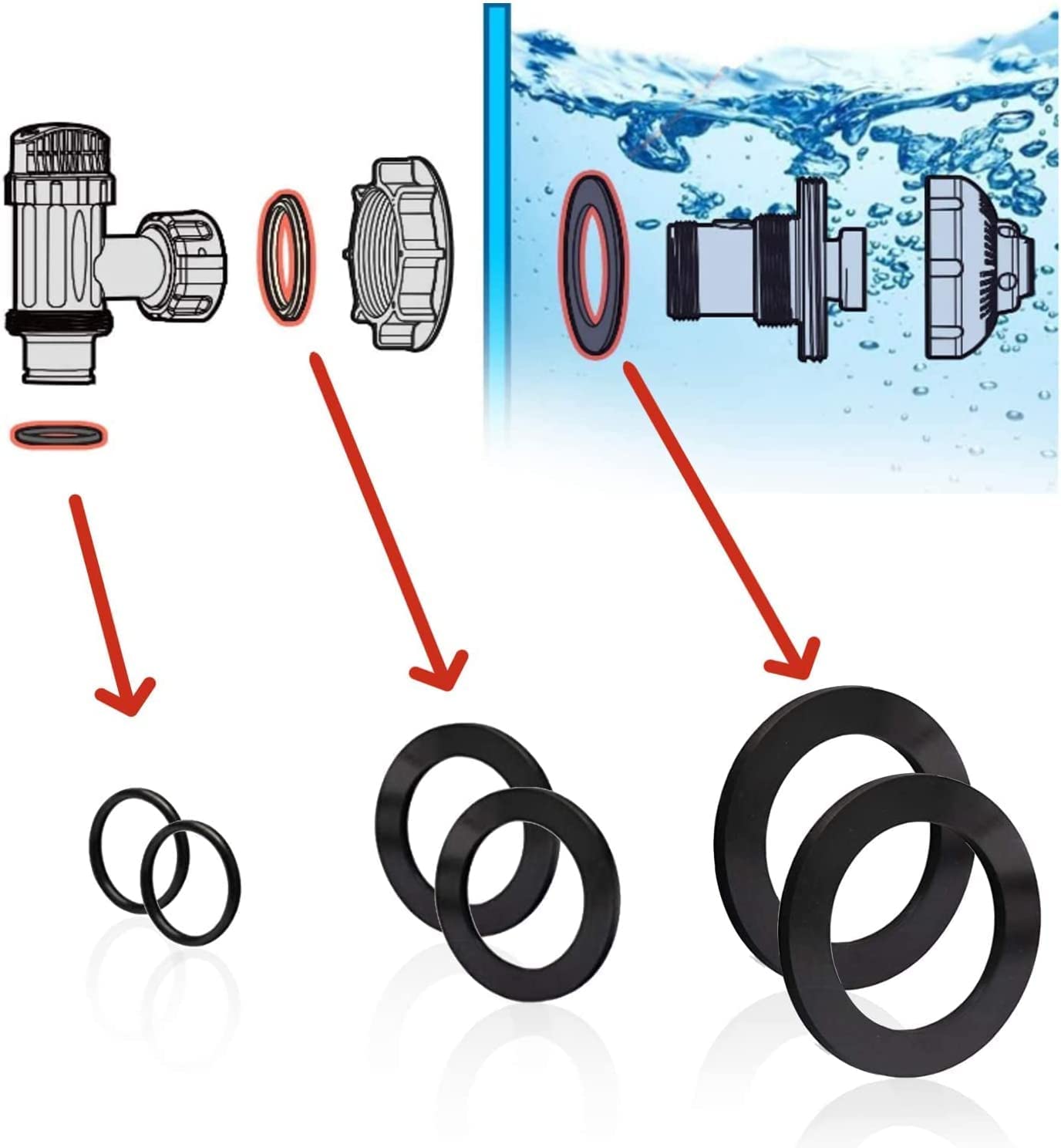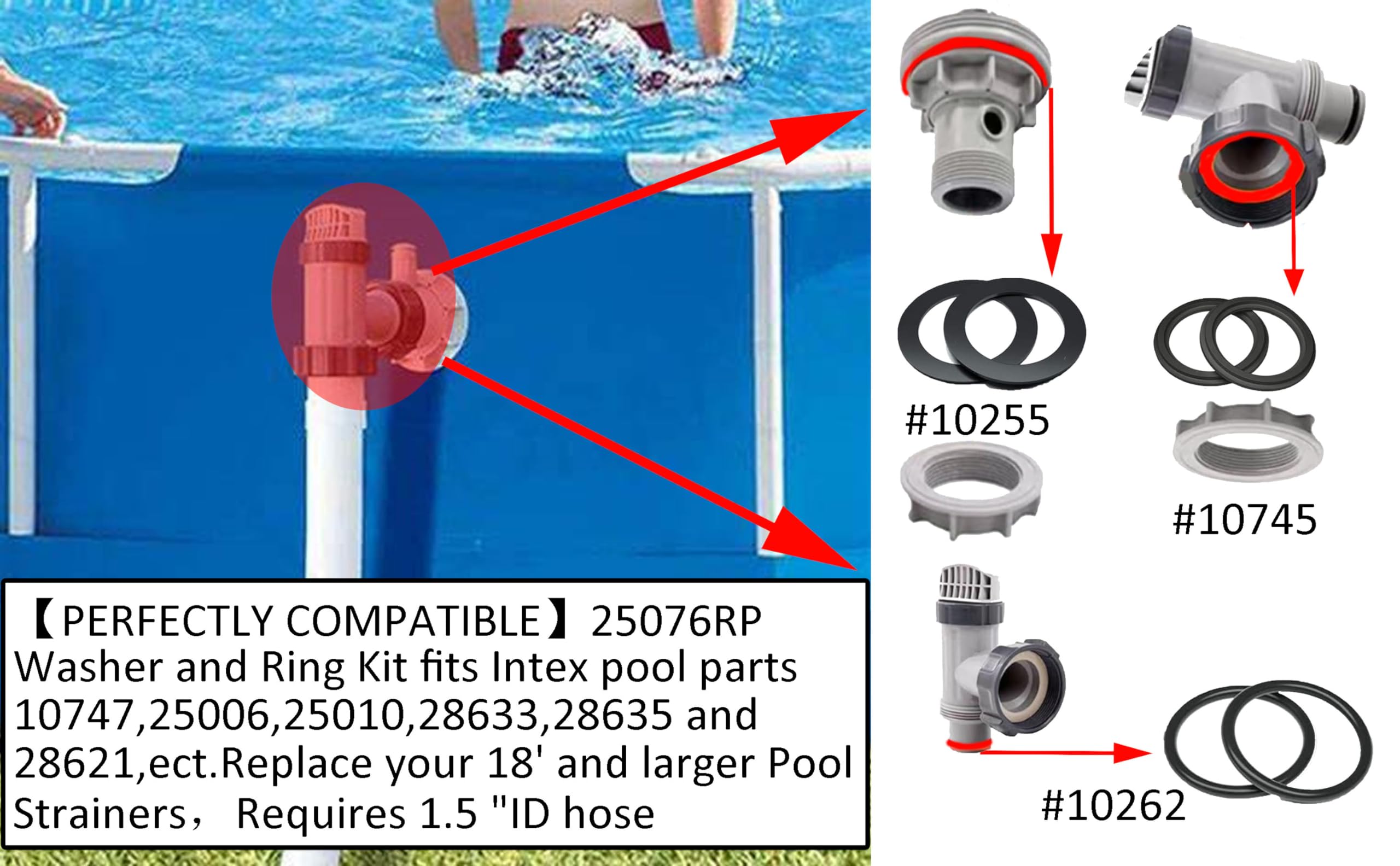 Compatible:This 25076RP large strainer rubber washer gasket set and ring pack is perfect for replacing Intex 18" and larger pool strainers. Fits for Intex pool parts 10747, 25006, 25010, 28633, 28635 and 28621, ect. Replace your 18' and larger pool strainers, requires 1.5 "ID hose.