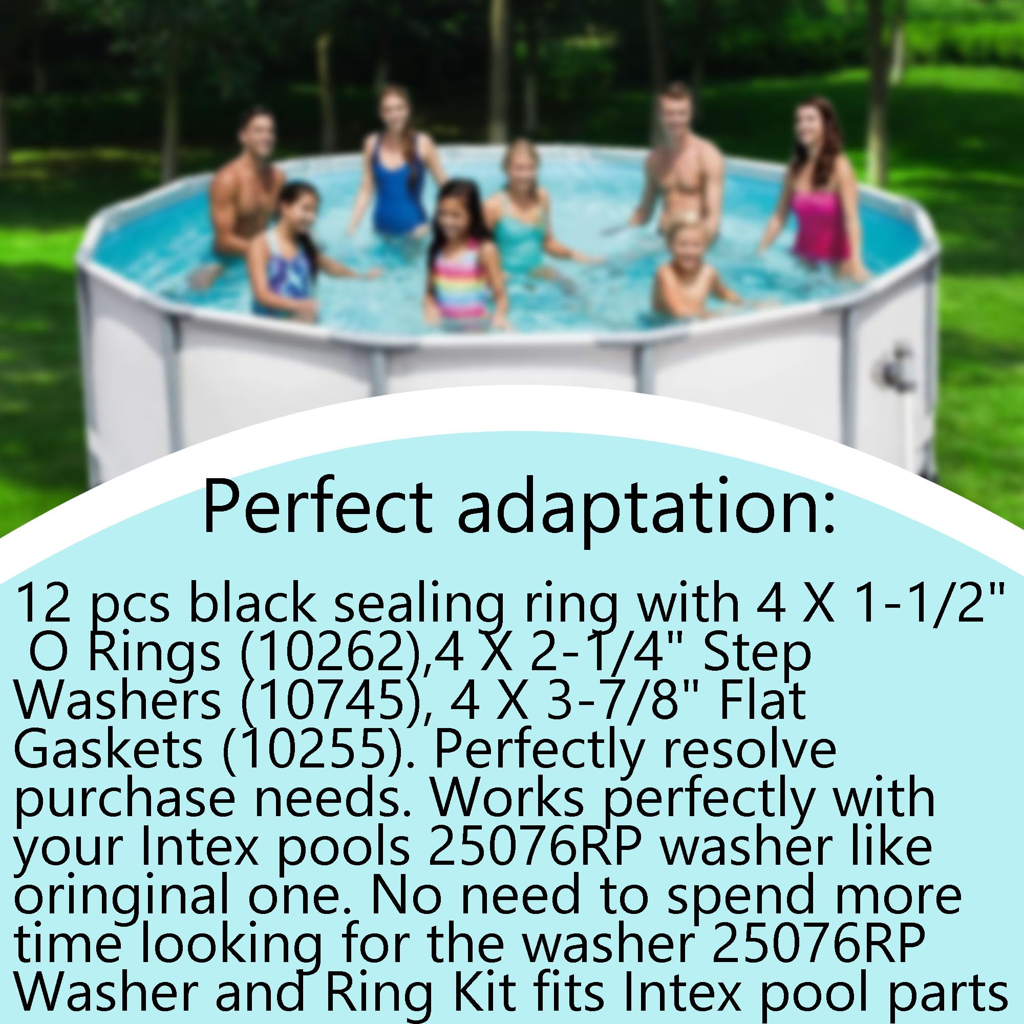 Packaging includes:12 pcs black sealing ring with 4 X 1-1/2" O Rings (10262),4 X 2-1/4" Step Washers (10745), 4 X 3-7/8" Flat Gaskets (10255). Perfectly resolve purchase needs. Works perfectly with your Intex pools 25076RP washer like oringinal one. No need to spend more time looking for the washer