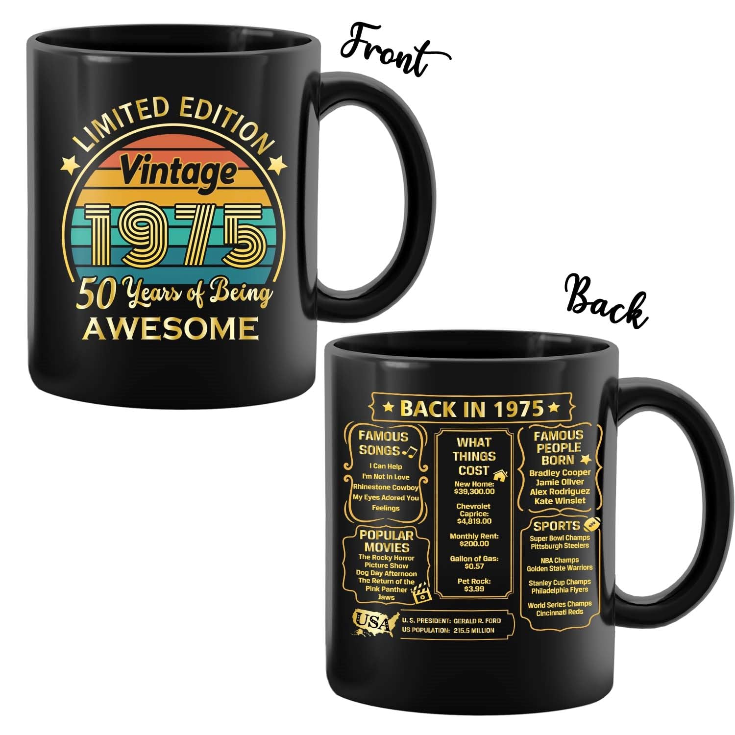 Nostalgic Design: Featuring a stylish and timeless design, this mug highlights the significance of the year 1975. Ideal for those who appreciate a touch of nostalgia, it's a unique and thoughtful gift that stands out from the ordinary.