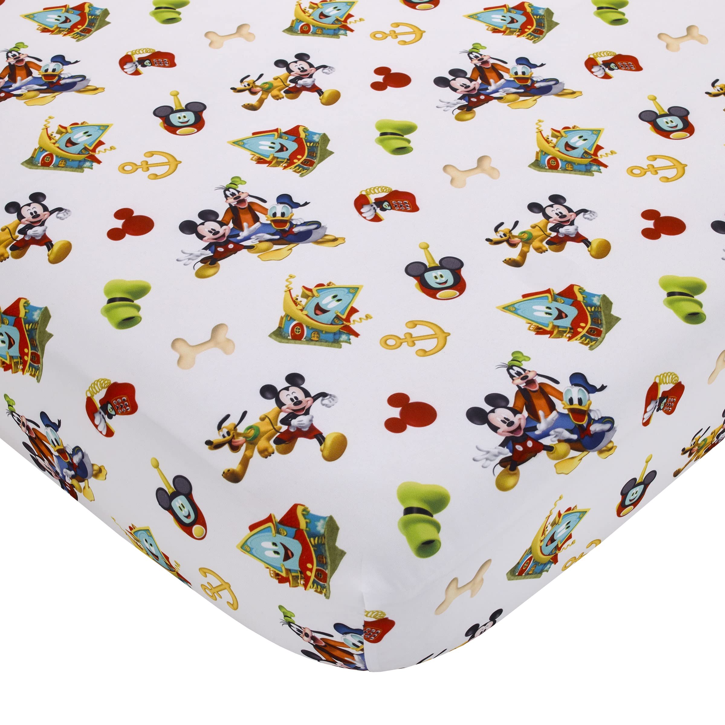 The Disney Mickey Mouse Funhouse Crew 2 Piece Toddler Sheet Set includes a reversible pillowcase and fitted bottom sheet. Both items feature Mickey Mouse, Funny the enchanted playhouse and the funhouse crew, Donald Duck, Goofy and Pluto! Designed in shades of blue, red, yellow, and white. All are made of super soft fabrics for a snuggly sleeping surface. The 20" x 30" pillowcase is reversible, and the fitted sheet measures 28" x 52" x 8". Includes full elastic edges for a safe and snug fit.