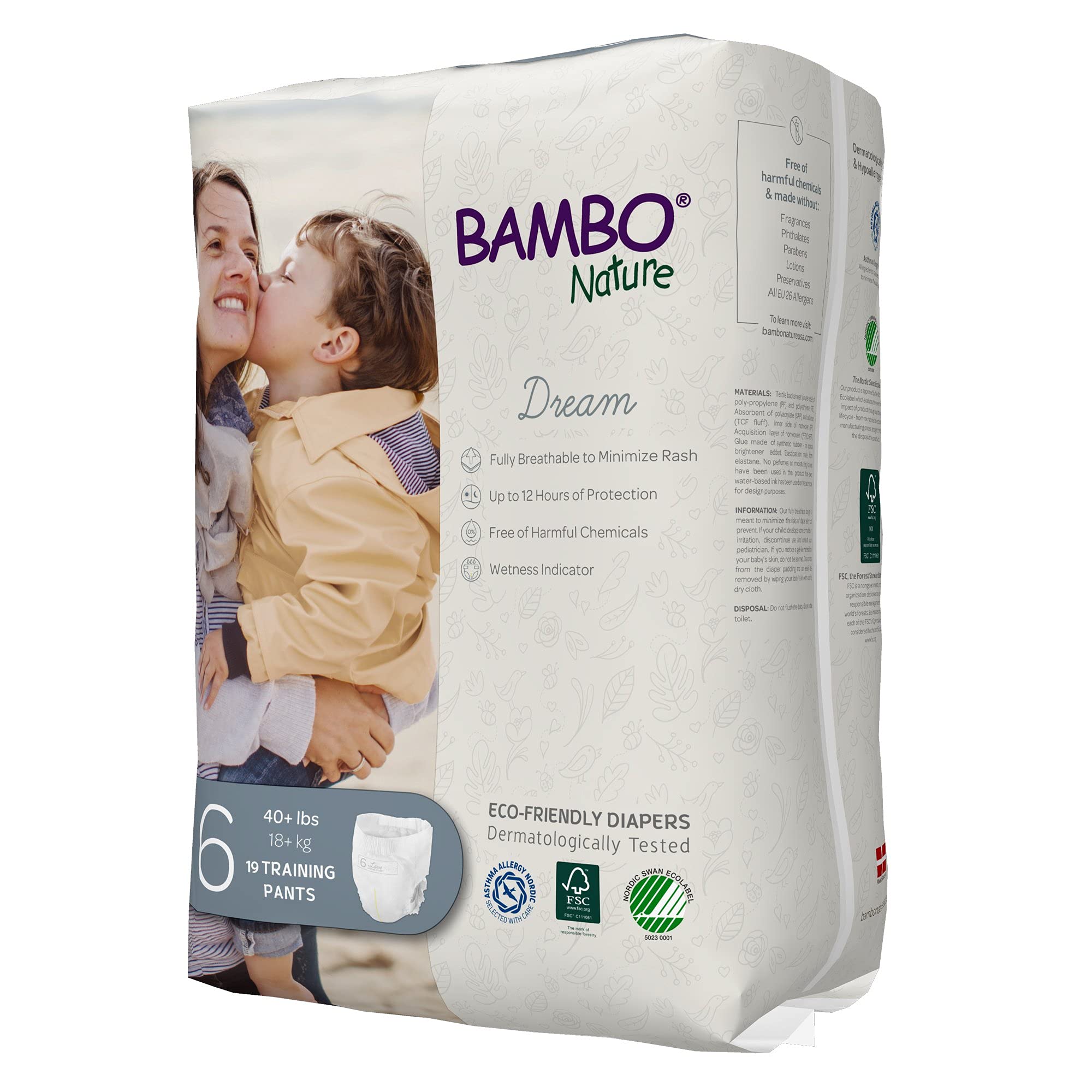 Bambo Natureβs disposable training pants are free of over 2500 harmful chemicals and known allergens. Now the fluff pulp is made TCF (totally chlorine-free). These training pants are designed to make potty training easy. Your toddler will feel like a big kid with our flexible, thin and easy to pull up and down design. Our training pants feature a three-layer design with a super absorbent core that can stand up to multiple wettingsβeven overnight. And just like our diapers, Bambo Nature Training Pants have a fully breathable backsheet to keep delicate skin dry. Now available in sizes 4-6!