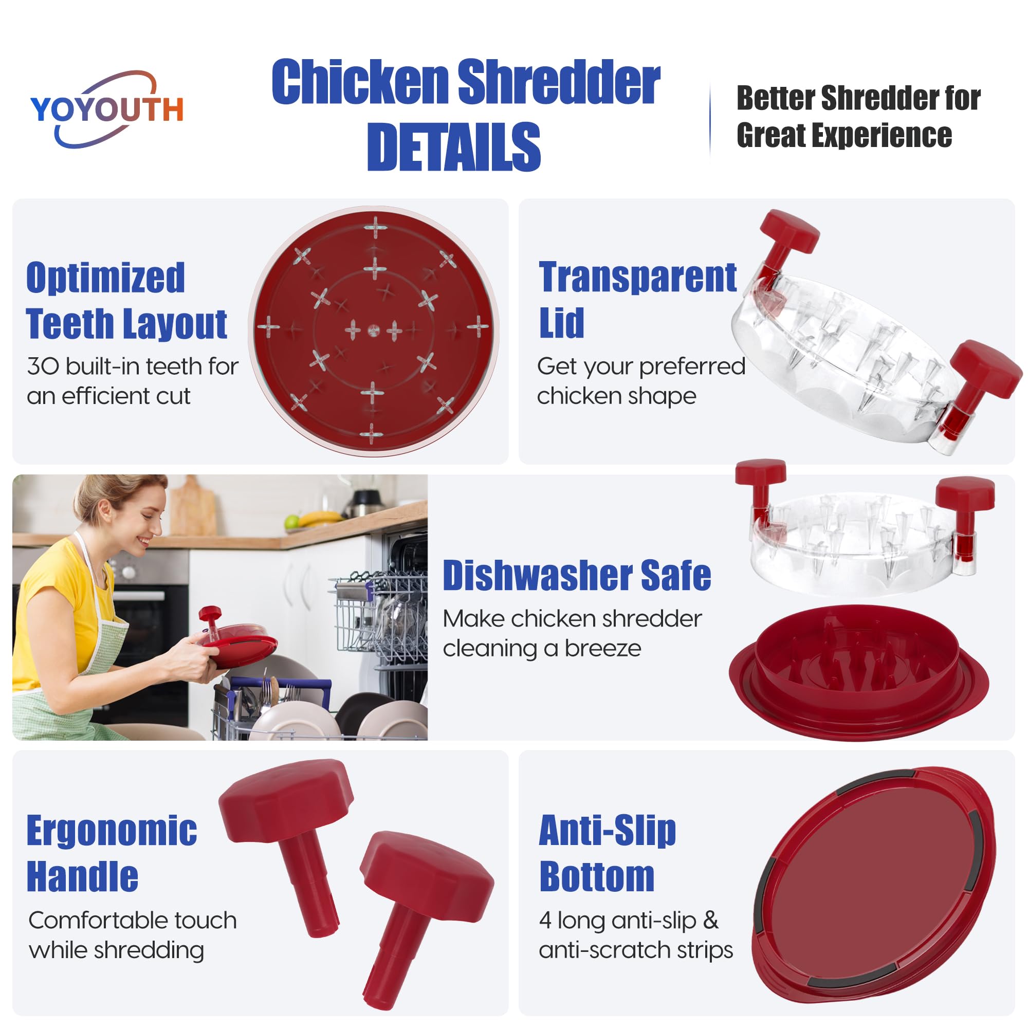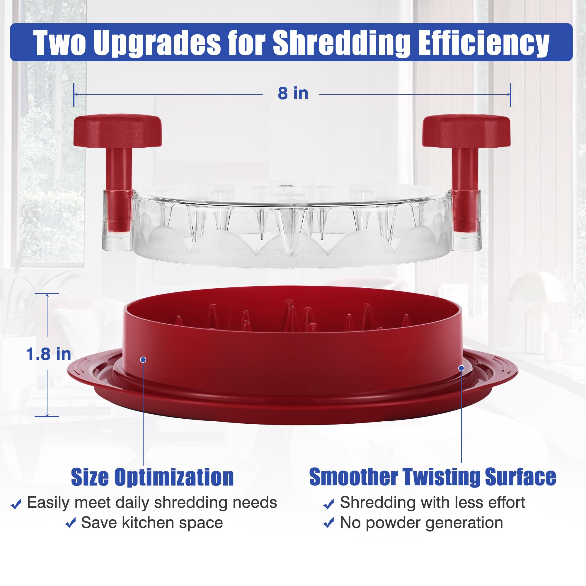 【33% Up in Shredding Efficiency】: With optimized layout, our chicken shredder's built-in teeth cover the entire area, and the extra spikes on the edges of the lid help gather shredded food in the middle for an even & efficient cut