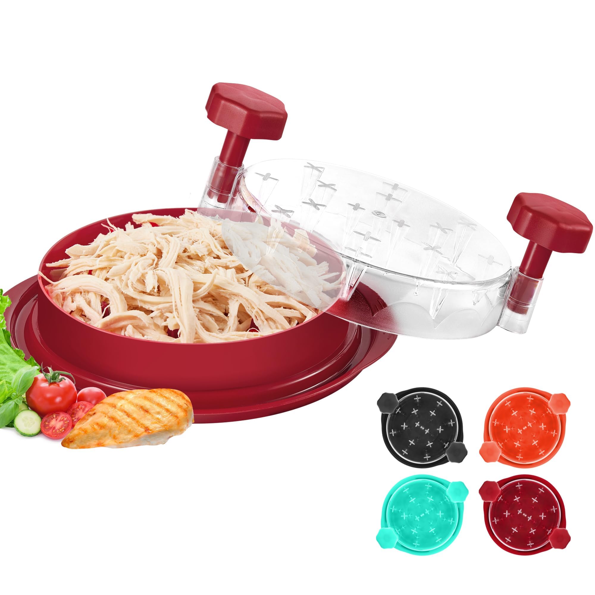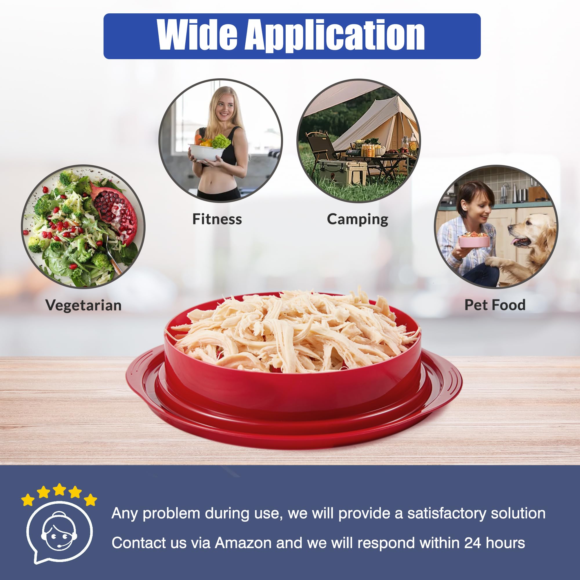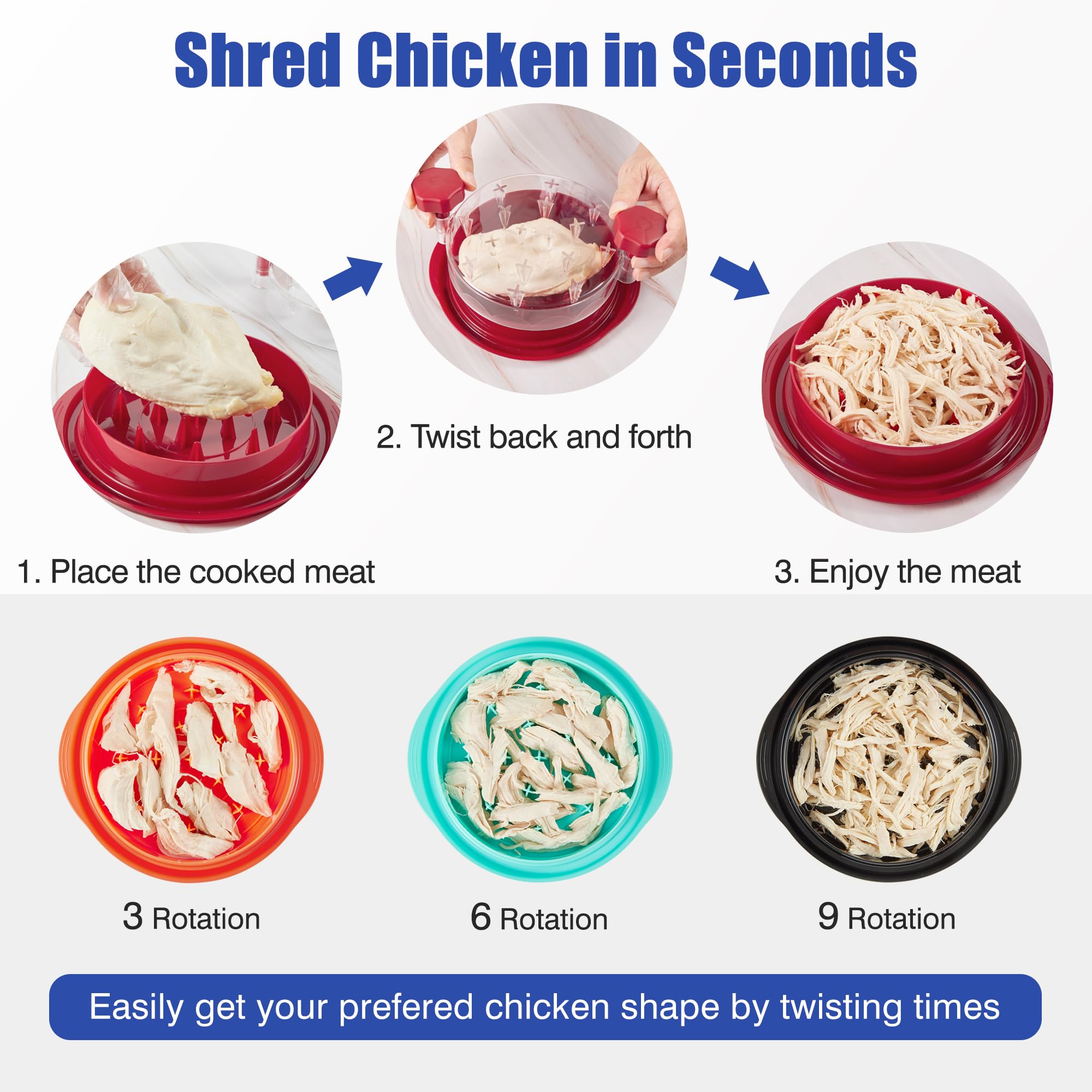 【Easy to Use】: ① Place the cooked meat into the chicken shredder; ② Cover with the lid and twist back and forth several times; ③ Open the lid to enjoy the shredded meat. Tip: You can see the meat state via the transparent lid, enabling you to adjust the times you twist to get your preferred meet shape