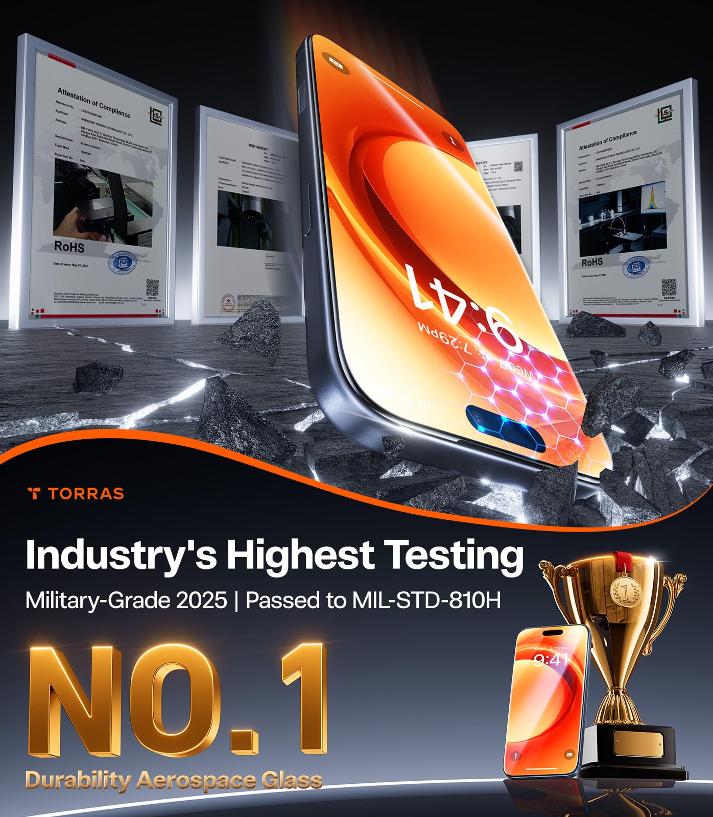 【9H+ Hardness, Unmatched Durability】TORRAS Screen Protector for iPhone 16 is MIL-STD-810G certified, enduring 10,000 abrasion cycles, over 1,000 scratches from a Swiss Army knife, and impacts exceeding 220 lbs. As the top performer among screen protectors, it’s built to last! Feel confident tossing your phone in your bag with sharp objects like keys or knives. GlassGo X, the world’s first screen protector made from aerospace-grade glass—the same material used in spacecraft—offers unparalleled scratch resistance, with over 138,860,000 packs sold globally.