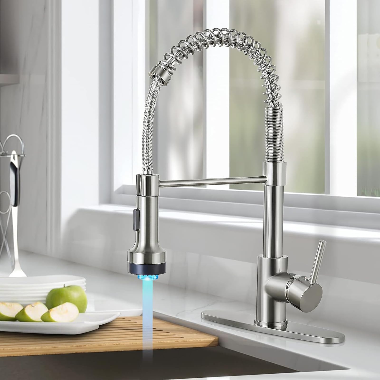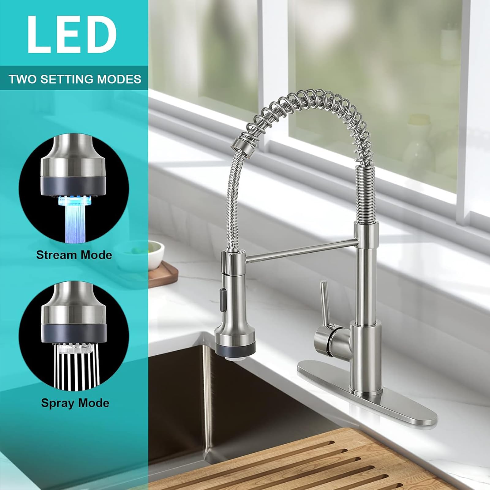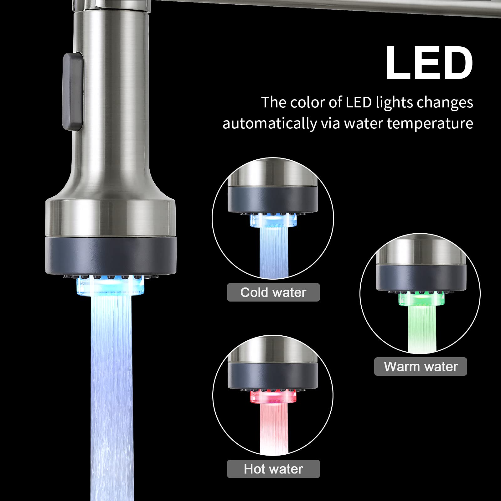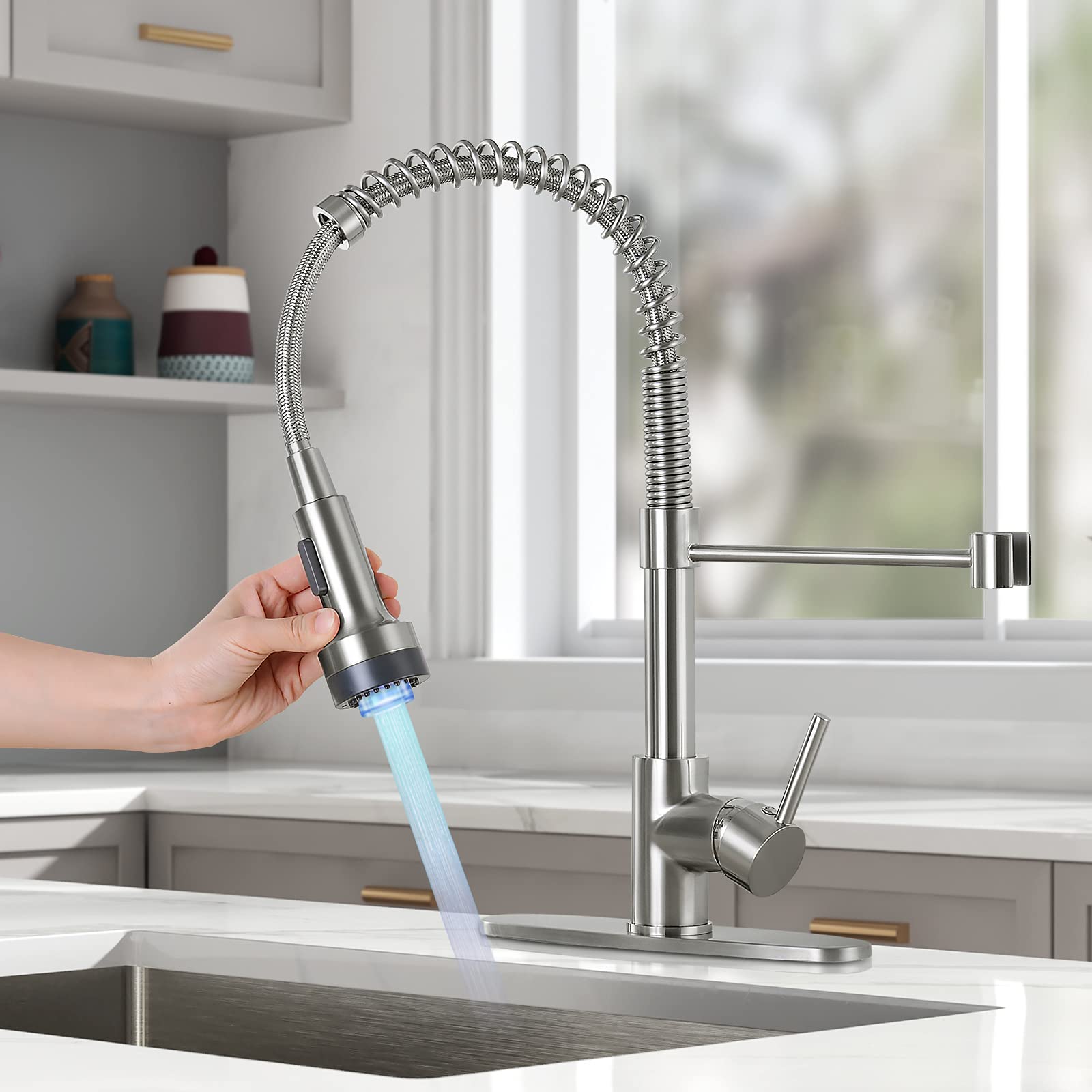 High Technology Multi-Functional LED Light: Premium multiple layer coated, resists rust and tarnish. Easy to clean, life-shine brushed finish resists fingerprints and water spots for a cleaner looking Kitchen. High arch 360° swivel nozzle to cover the entire sink. Smooth single handle design integrates to control water temperature and flow volume easily.