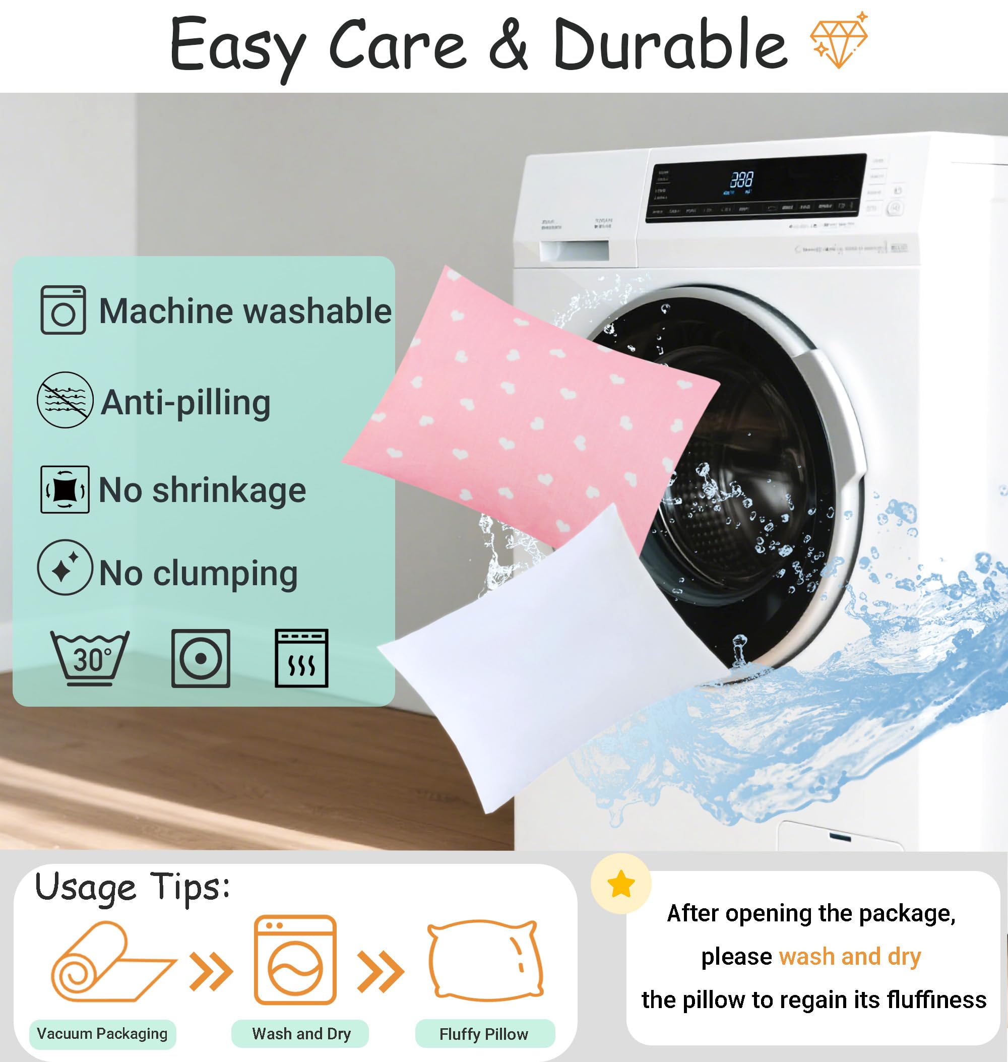 EASY CARE: Machine washable and tumble dryable; no shrinking, pilling, and clumping, sun-cure your pillows regularly to keep them fluffy