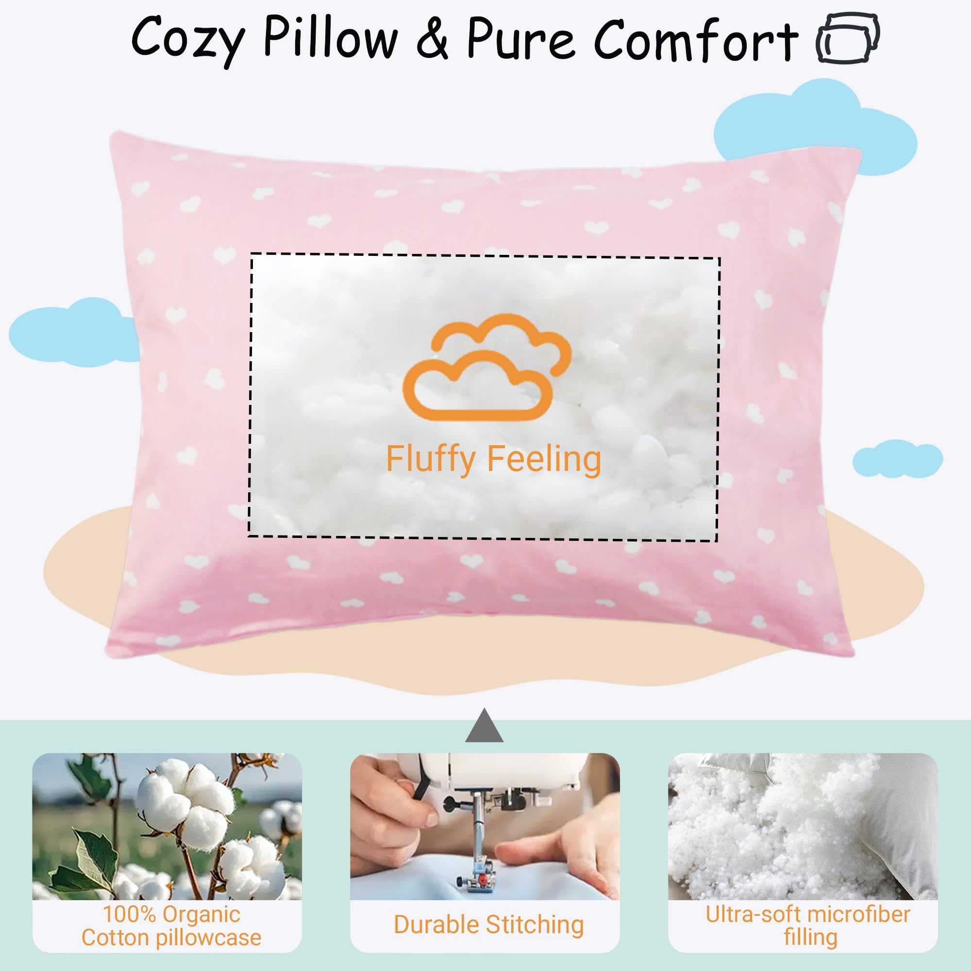 PACKAGE INCLUDE: 1 toddler pillow 13x18 and 1 toddler pillowcase 14x19, After opening the package, please wash and dry the pillow to regain its fluffiness