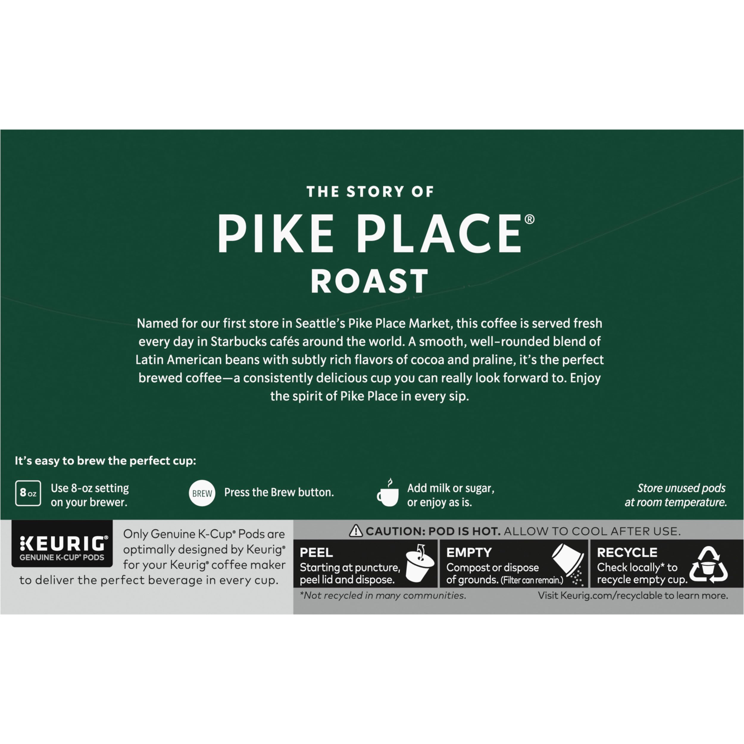 Named for the first Starbucks store in Seattle’s Pike Place Market, this coffee is served fresh every day in Starbucks cafés around the world. A smooth, well-rounded blend of Latin American beans with subtly rich flavors of cocoa and praline, it’s the perfect brewed coffee—a consistently delicious cup you can really look forward to. Enjoy the spirit of Pike Place in every sip. Nestlé uses Starbucks trademarks under license. © 2025 Starbucks Coffee Company. Pike Place is a registered trademark of The Pike Place Market PDA, used under license. Keurig and K-Cup are trademarks of Keurig Green Mountain, Inc., used with permission.