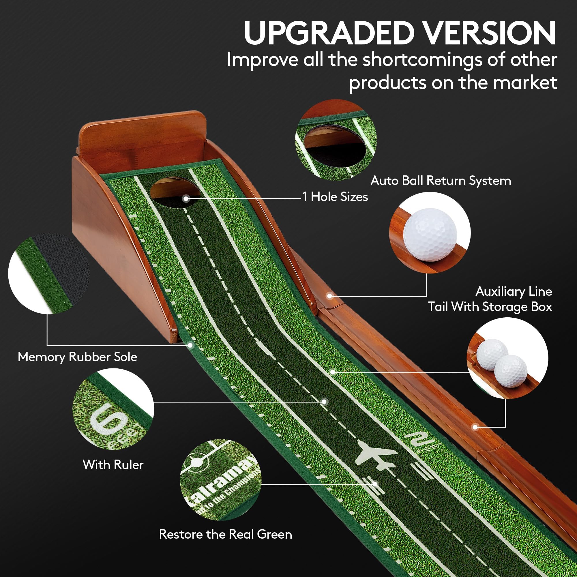 【Smooth and seamless practice of two ways to return the ball】: Feel the difference of Kalramay's premium putting green non-humping natural rubber mat. with inches and auxiliary lines simulates the challenges of a real golf course. The built-in automatic ball return system and convenient ball storage box (the tail is equipped with two ways to return the ball: curved return tail and storage box) make every practice more efficient and enjoyable.(No practice ball included)