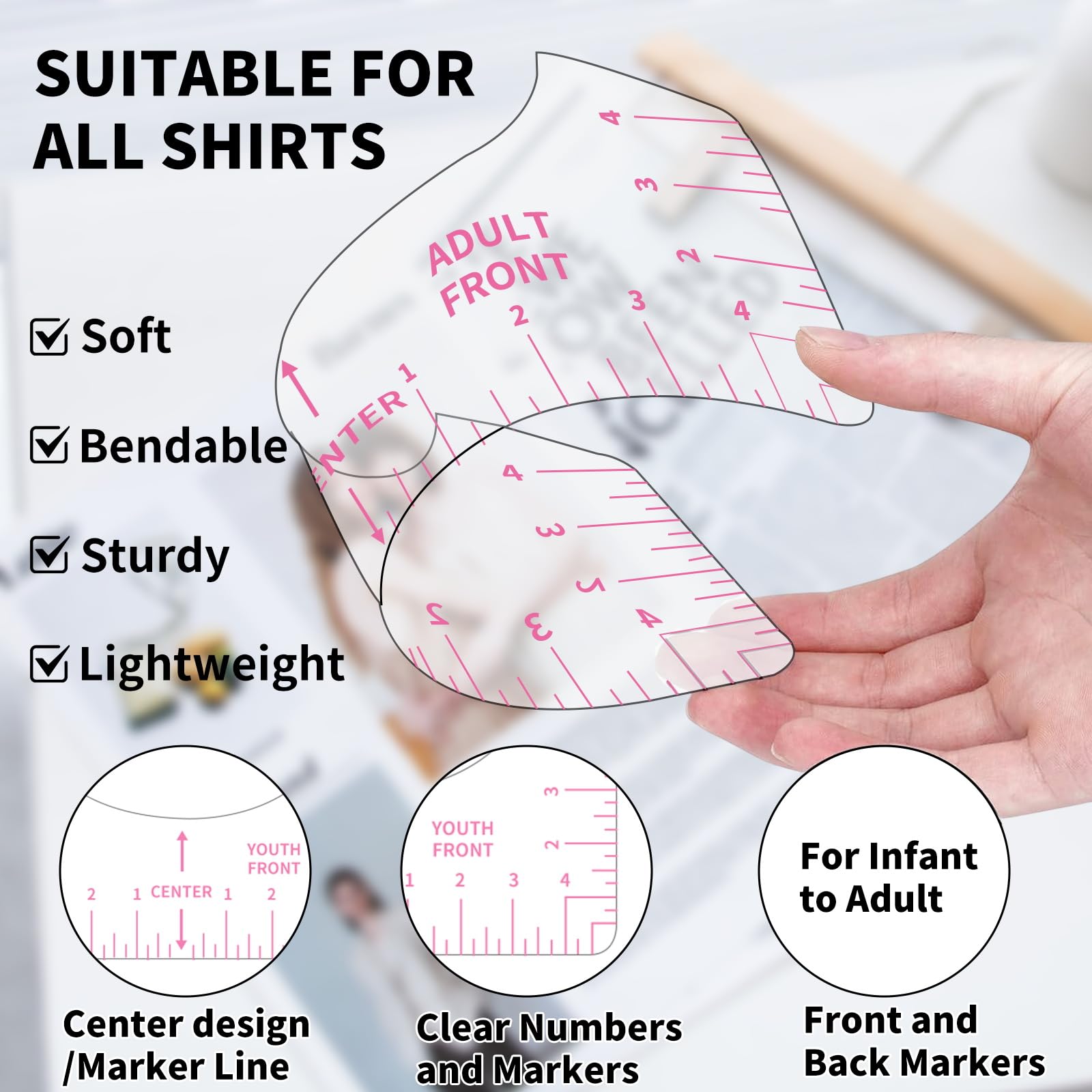 đăMeet Different NeedsăThe rulers comes with 4 Styles, they are applied to all kinds size: Adult, Youth, Children and V-Neck. The rulers have advanced UV printed graduated numbers and marks that are clearly visible on the ruler guide, they are easy to read against almost any shirt color. Measurement has made easier by inch marks on both side of this shirt measurement tool for vinyl set.