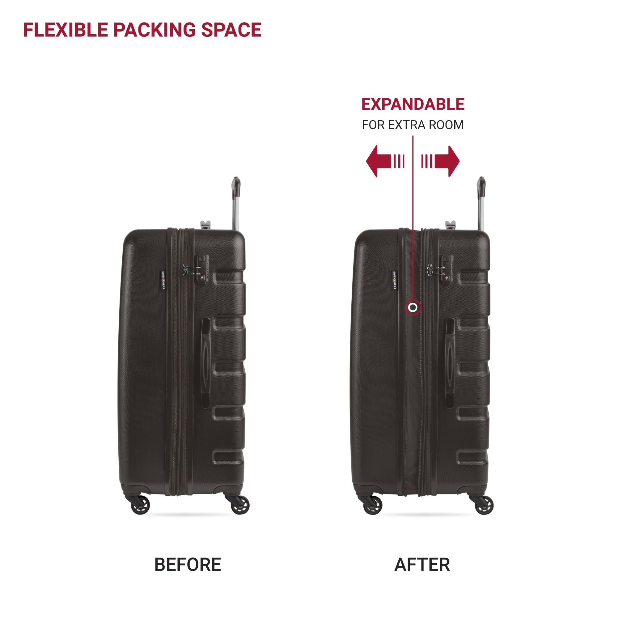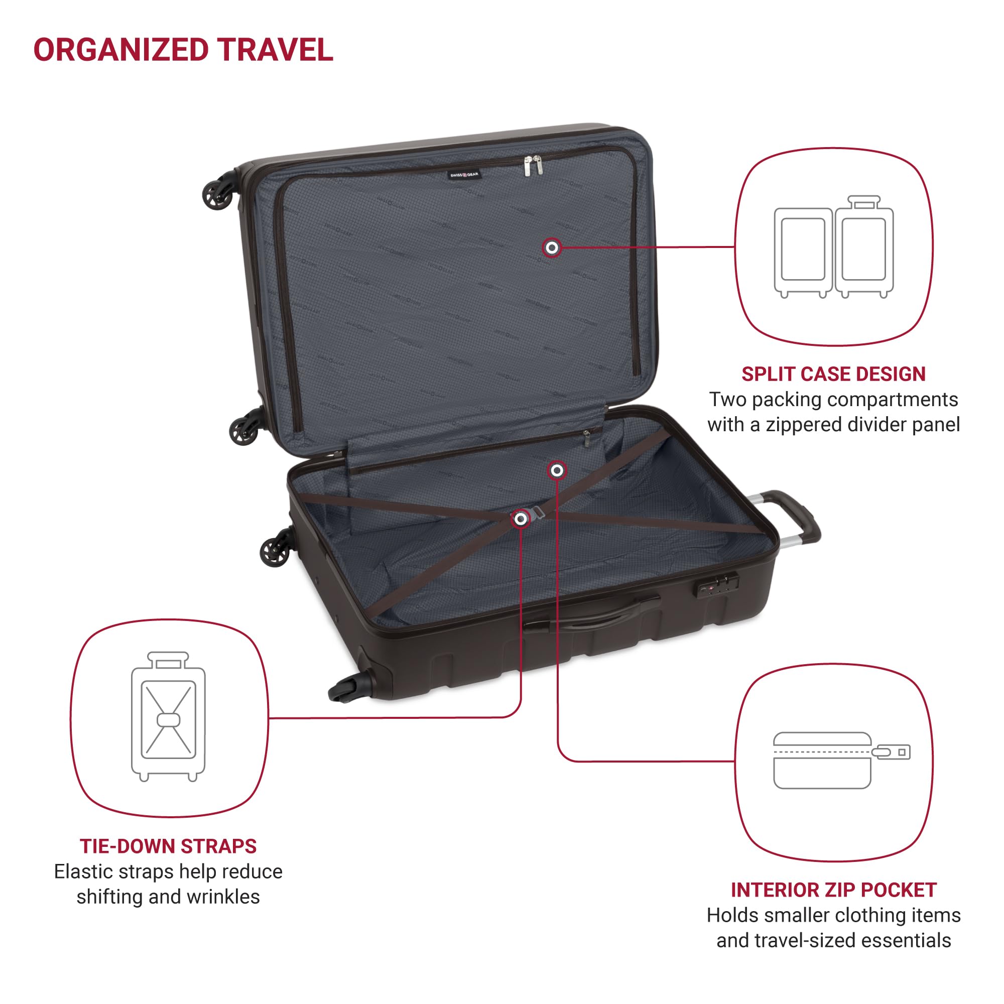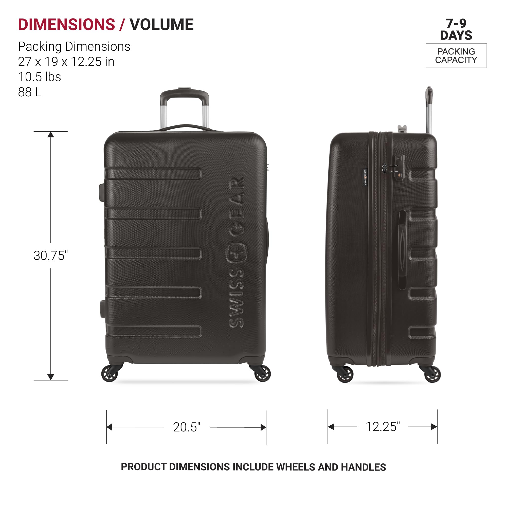 Description The SwissGear Signature Hardside Expandable Luggage with Spinner Wheels is the perfect luggage for your next trip. This 27-inch suitcase is durable, lightweight, and features a split-case design that expands for additional packing space with a variety of internal pockets to keep you organized. The four 360-degree multi-directional spinner wheels and a premium, push-button steel locking telescopic handle make it easy to navigate through the airport. With outside dimensions of 30.75 x 20.5 x 12.25 inches including wheels and handles, this suitcase offers 27 x 19 x 12.25 inches of packing space. This hardside luggage is perfect for those who need a lightweight and durable suitcase for their travels. The hardshell exterior is designed to protect your belongings from the wear and tear of travel, while the spinner wheels and telescoping handle make it easy to move around. Plus, this suitcase comes with a 10-year warranty against defects in materials and workmanship.