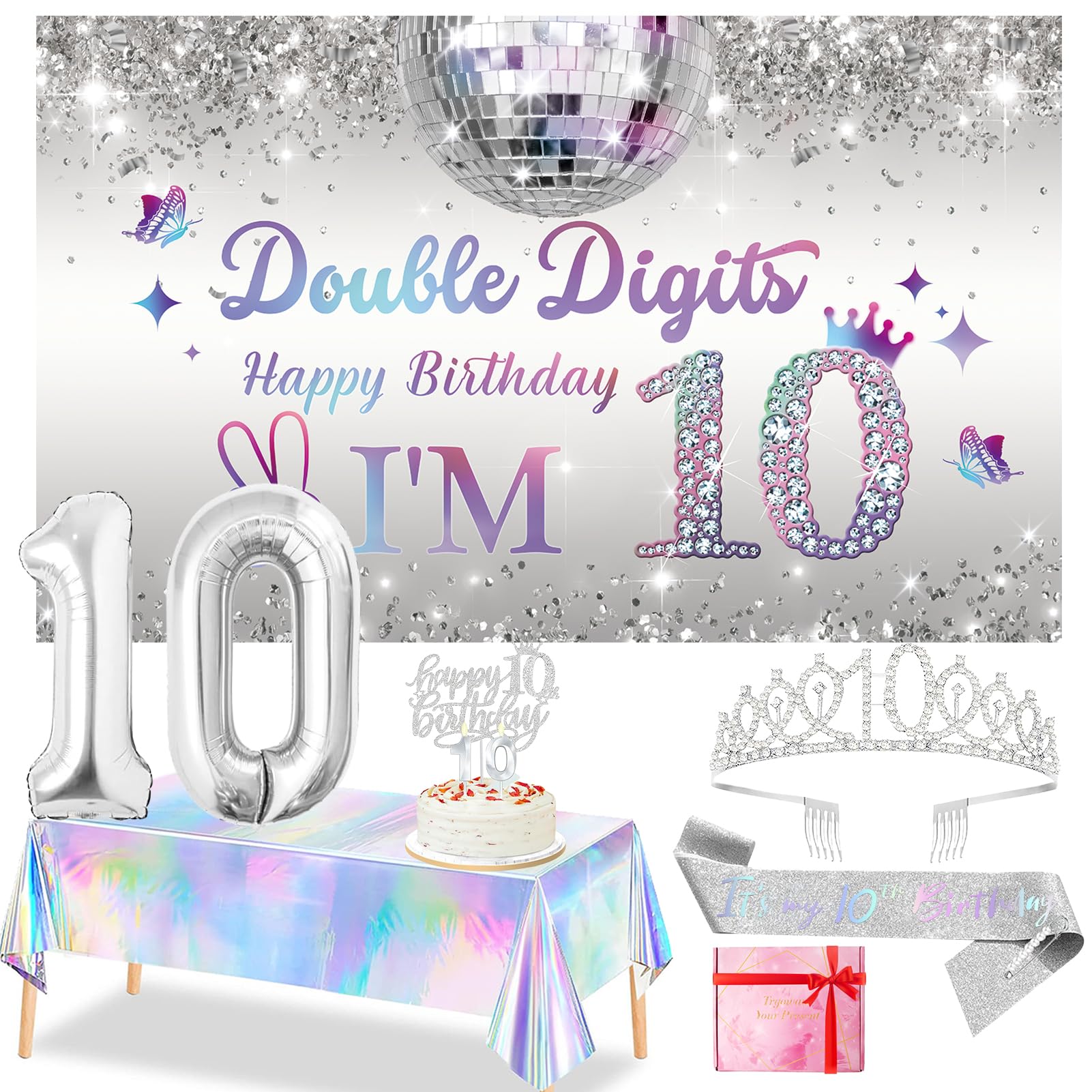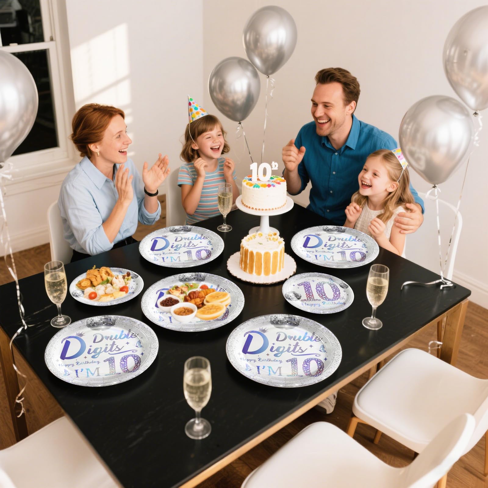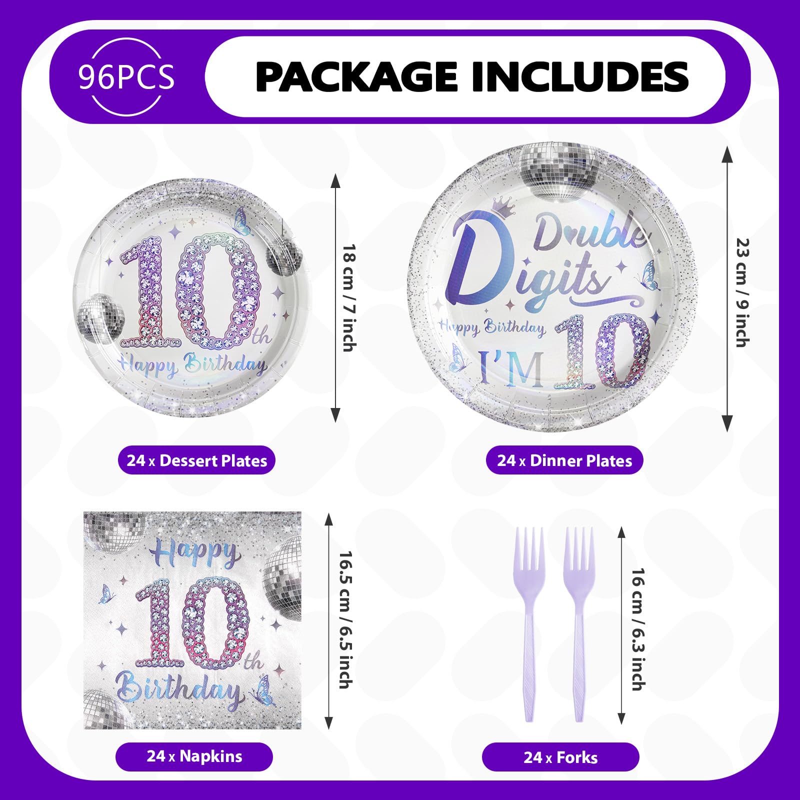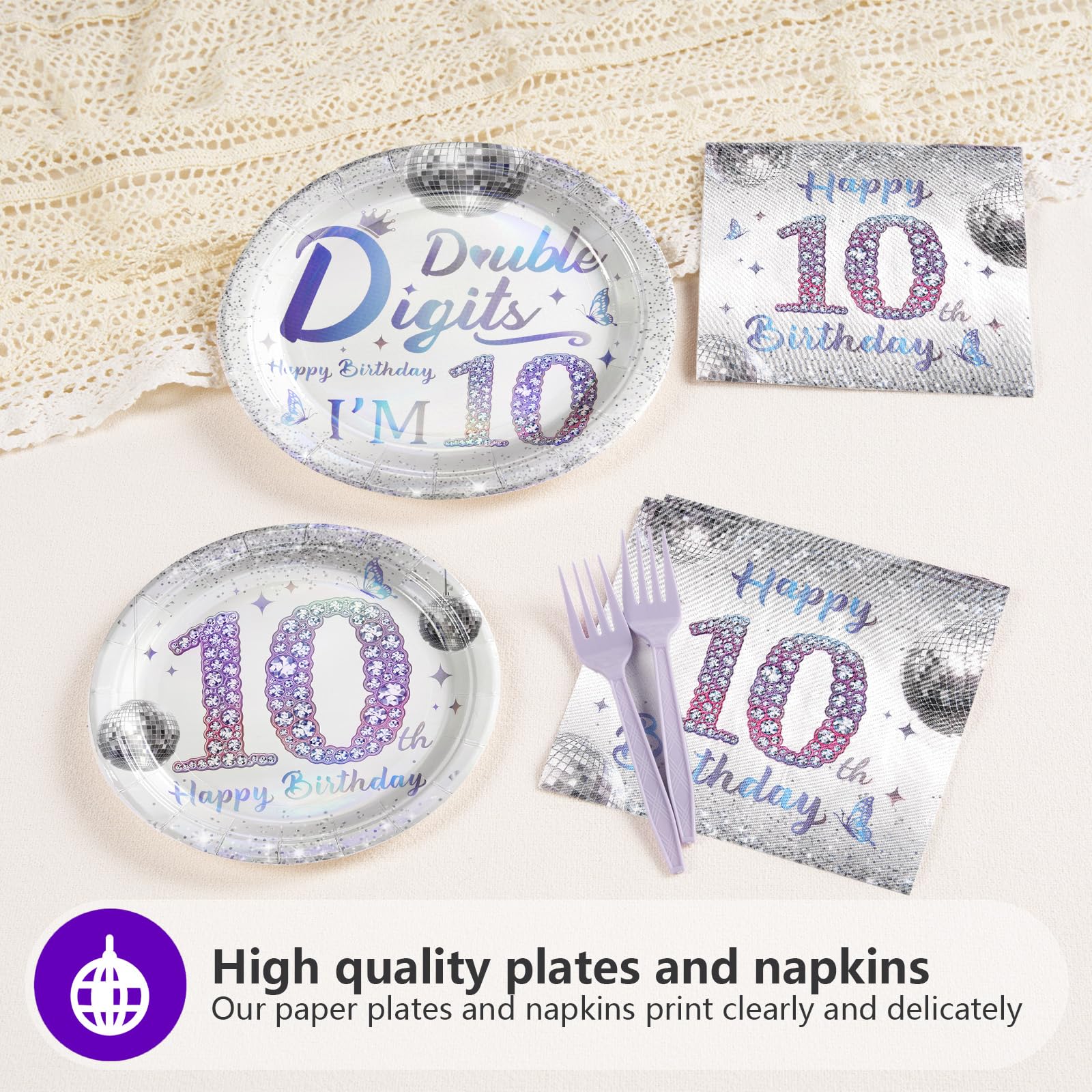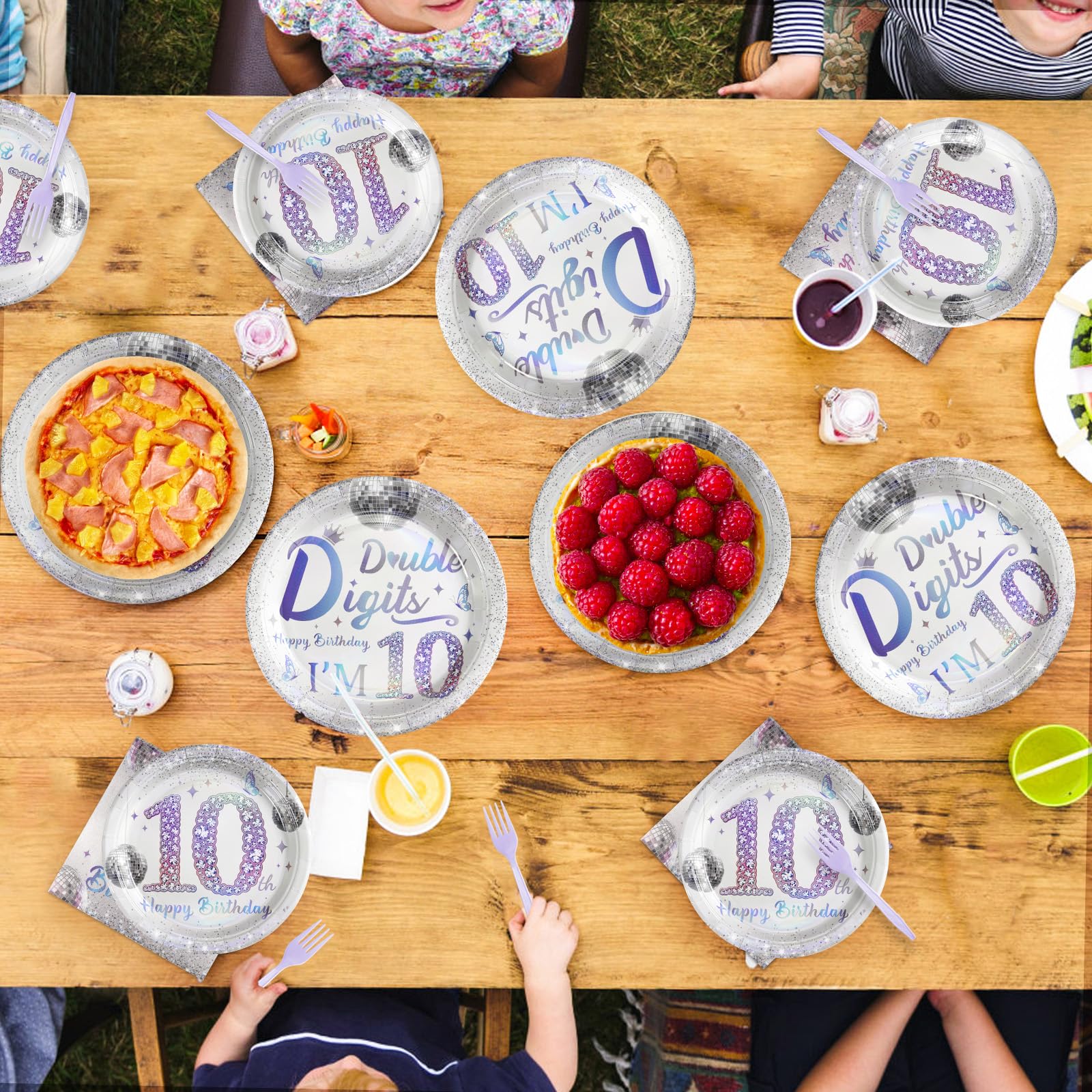 Grencian 96 Pcs Disco 10th Birthday Decorations for Girls Boys Silver Dazzle Double Digits Plates Supplies Disposable Iridescence Happy 10th Birthday Tableware Set for Kids I'm 10 Themed Party Favors