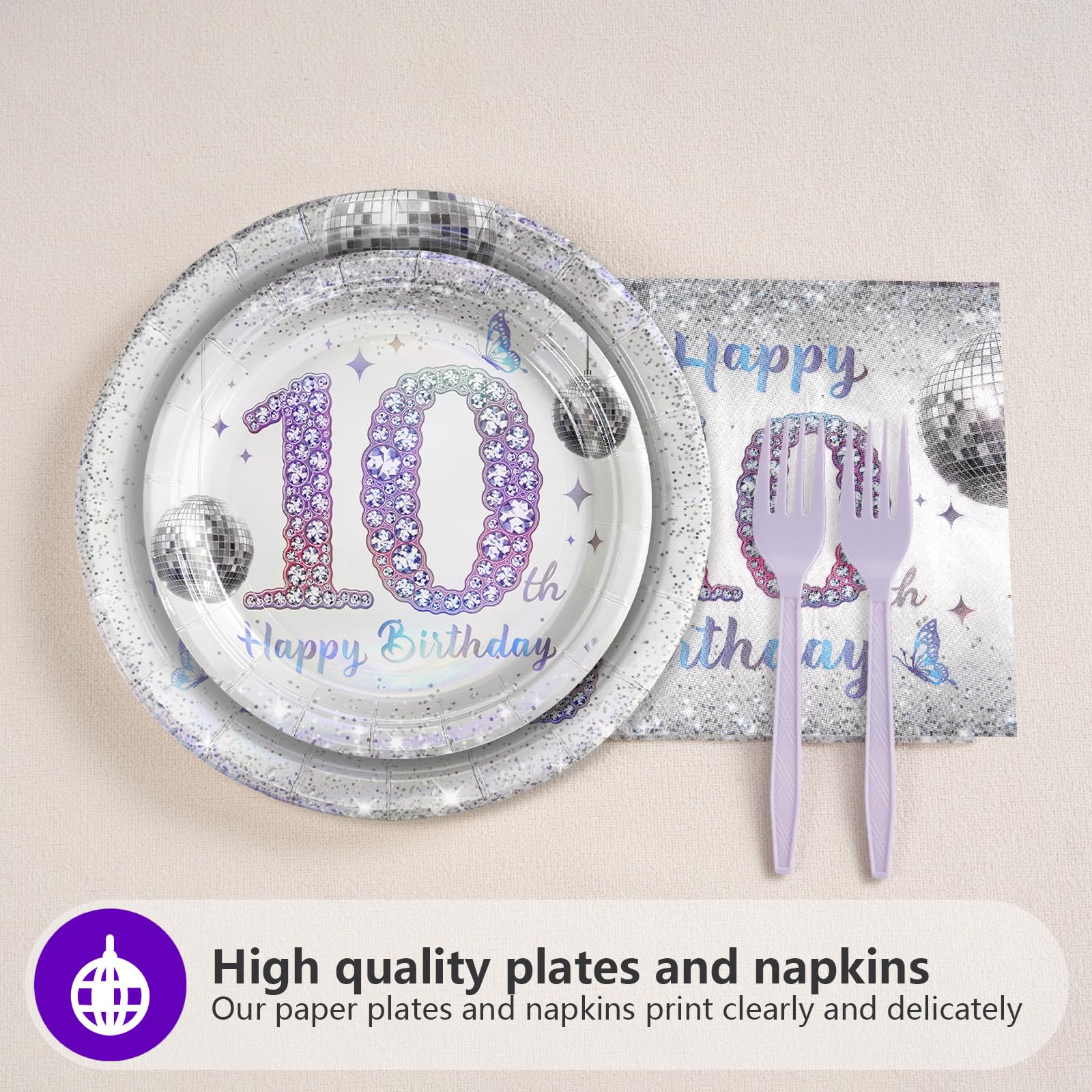 Premium Material: Our 10th iridescence disco giltter themed plates are made of high quality thick paper, 350g weight is more sturdy and durable. The napkins are soft and absorbent. Forks are made of high quality plastic, not easy to break. Patterns and colors are beautifully printed and not easy to fade. All made from food grade materials to ensure a hassle-free celebration.(Please note: do not microwave the plates for safety precautions.)
