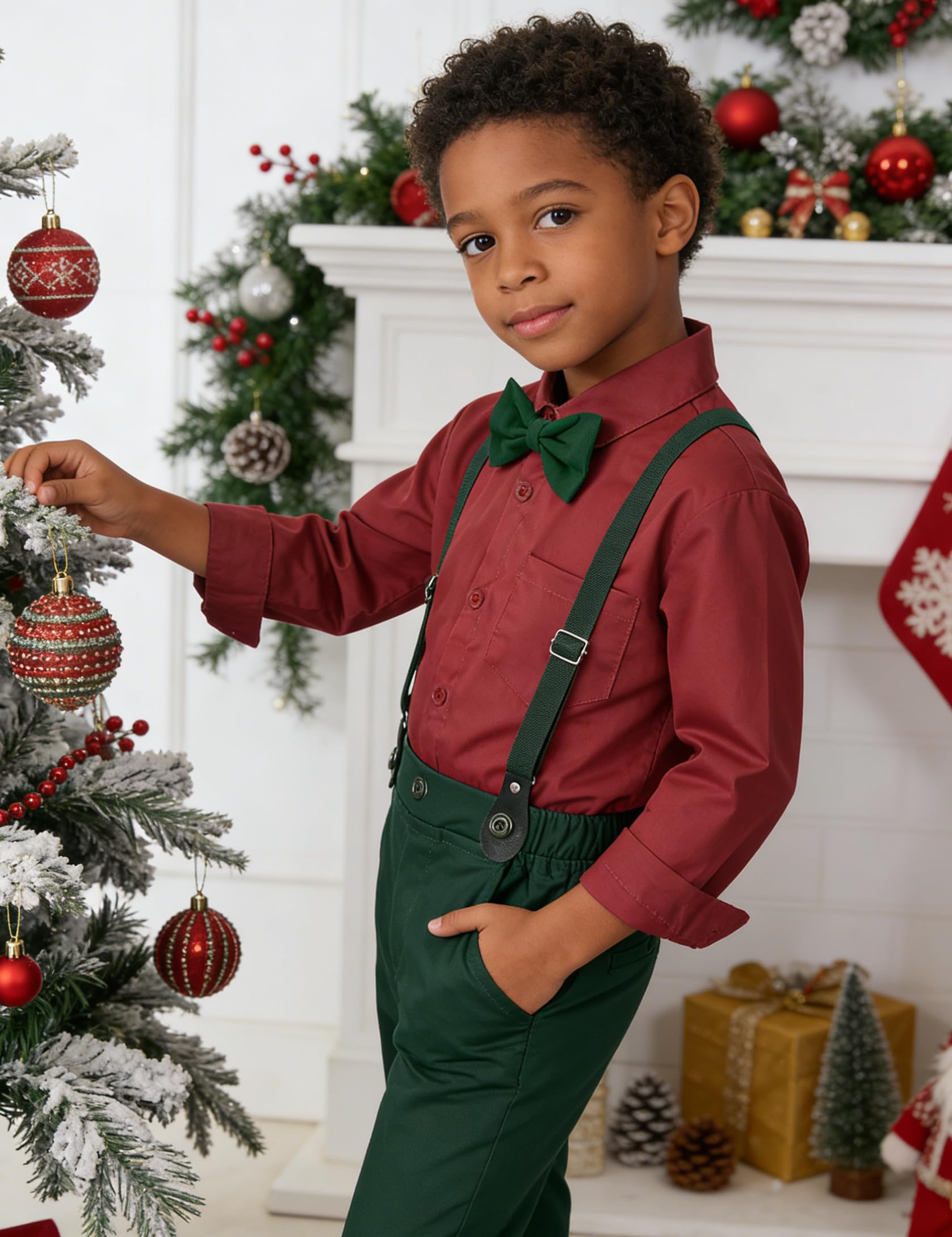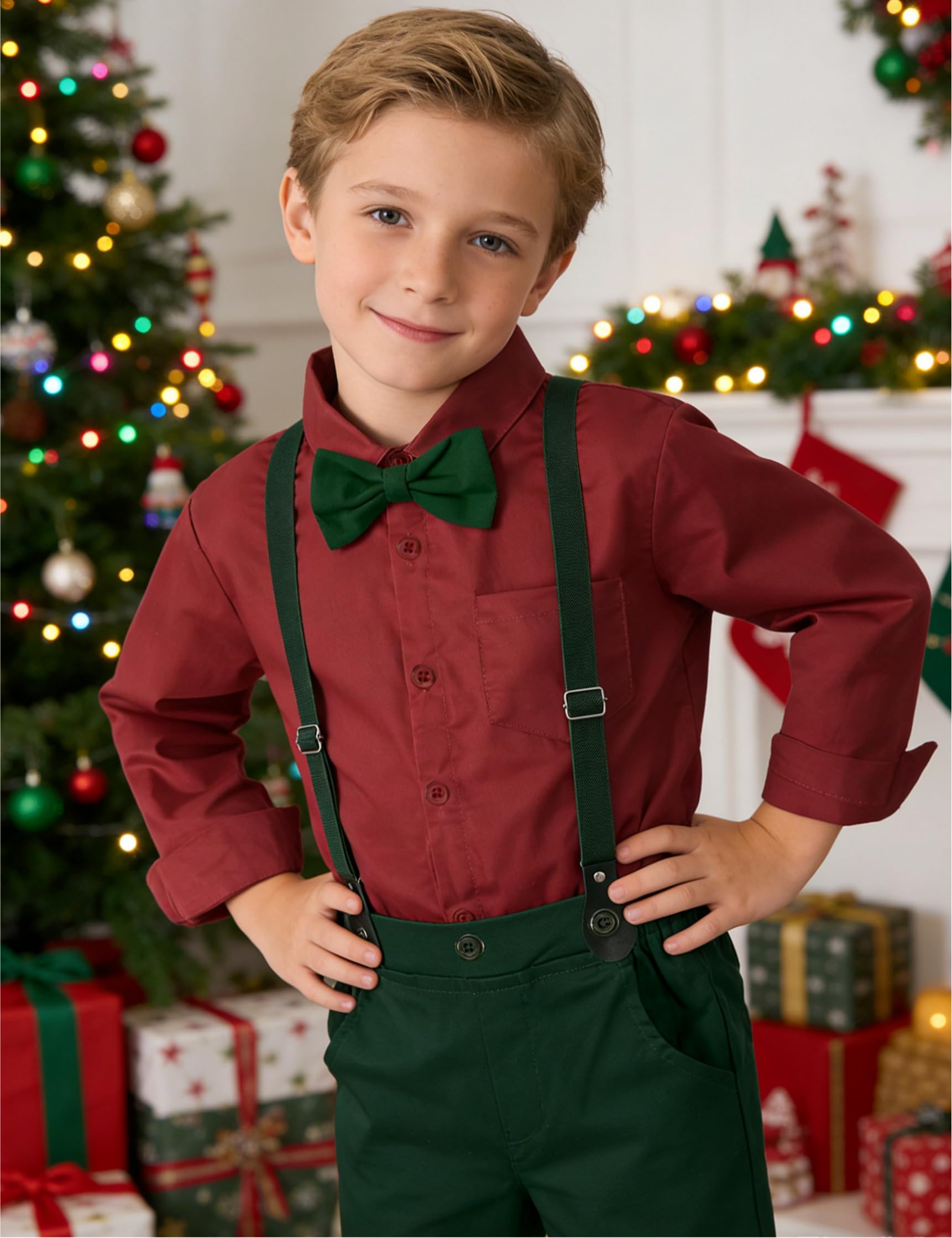 Toddler boy dress outfit consists of long sleeve dress shirt, elastic-waist pants, detachable bow tie and stretch suspender.