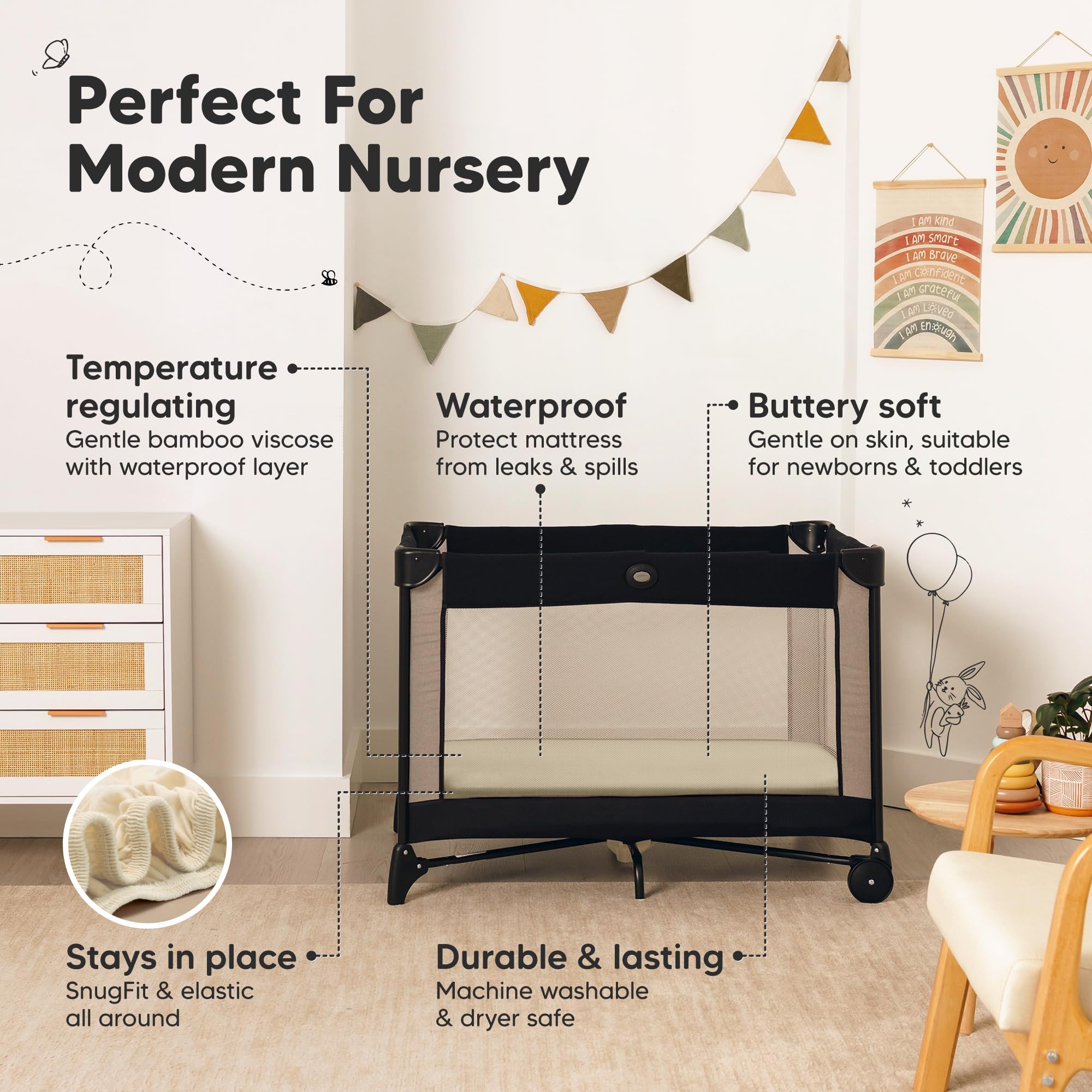 Easy To Put On - Our mini waterproof crib sheet uses SnugFit Tech, a smart fabric knit that allows the fabric to stretch when you are fitting or removing the mini crib sheets neutral from the toddler crib. No more struggling with rigid fabric!