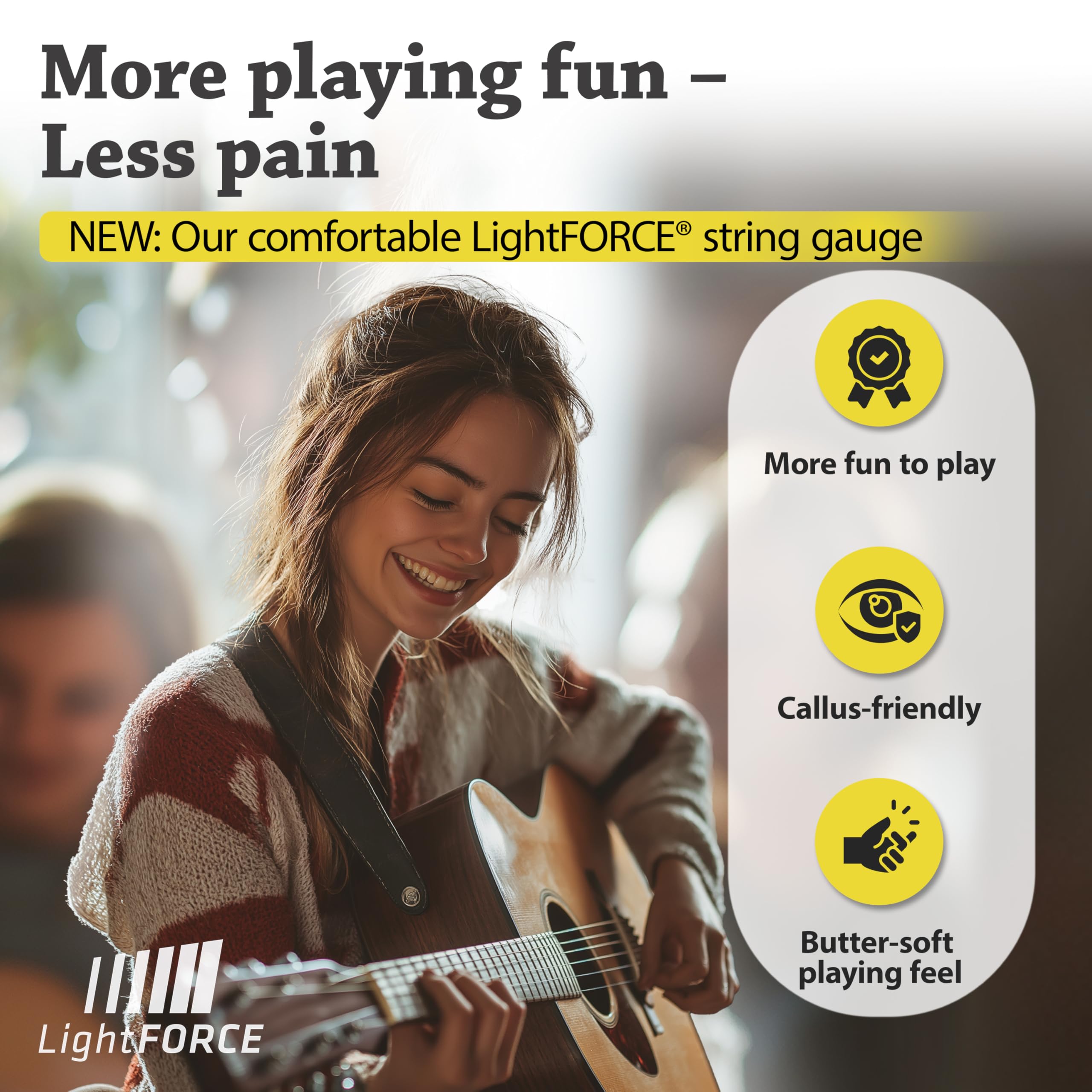 【PAIN-FREE-PLAYING】Our LightForce strings for acoustic are as soft as butter and require much less force than other manufacturers' strings. With our Light Force strings, you can play for hours without pain. Also, you will have a cleaner grip and get to enjoy your playing sessions more and enjoy your new acoustic guitar accessories!