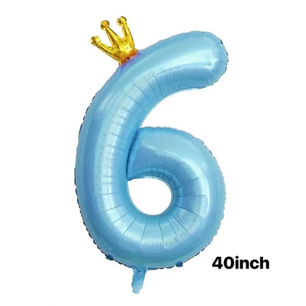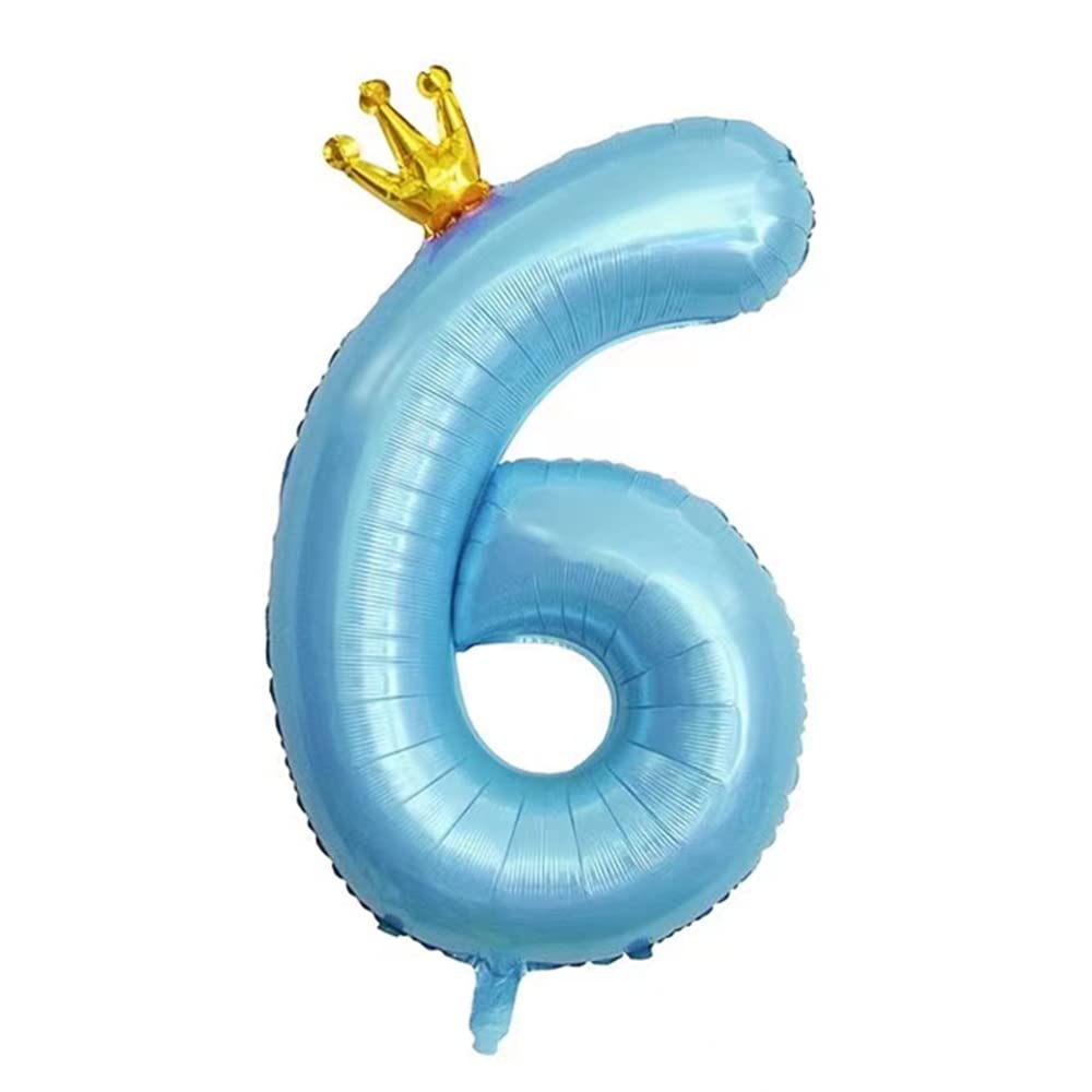 Package includes: 1 * 40 inch blue conjoined crown number 6 balloons,1 straw.