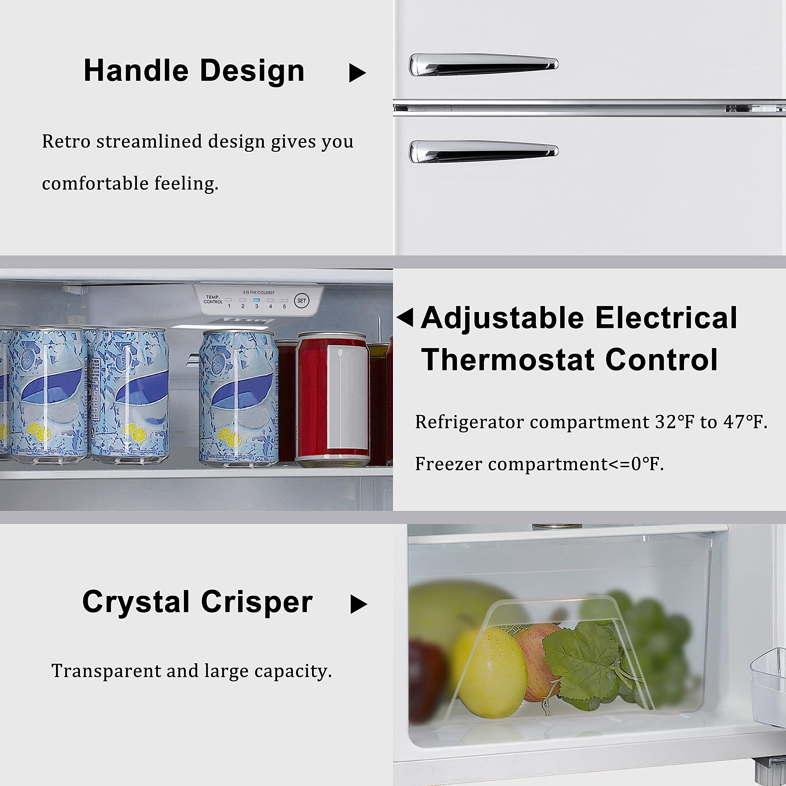 Product Features Retro Style Frost Free/ Adjustable Electrical Thermostat Control 1 Crystal Crisper 1 Crisper Glass Cover 4 Full Slide Out Glass Shelves Top Mount Freezer Compartment 2 Gallon Bottle Door Storage 9 Cans Dispenser Interior Light 2 Leveling Front Legs Specifications Capacity: 12.0 Cu.Ft Fresh Food Capacity: 9.36 Cu.Ft Freezer Capacity: 2.65 Cu.Ft Voltage: 120Volts/ 60Hz Annual Energy Consumption: 312 Kwh Installation Type: Free Standing