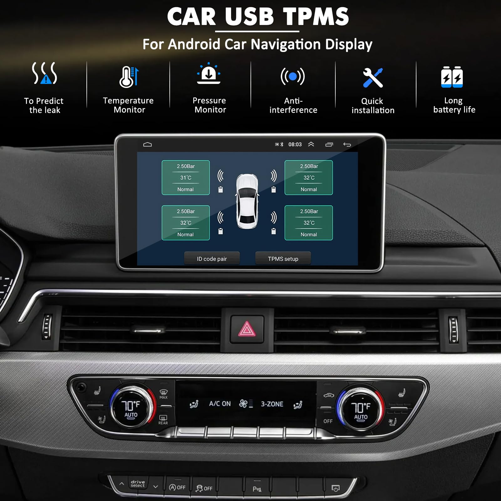 Clear LCD Display:This TPMS for Android navigation uses color display shows pressure, temperature and sensor charge. Dual charging and auto sleep function, ignition/USB powered operation. 4mA sleep mode saves power when parked. Clear battery indicator for peace of mind on the road