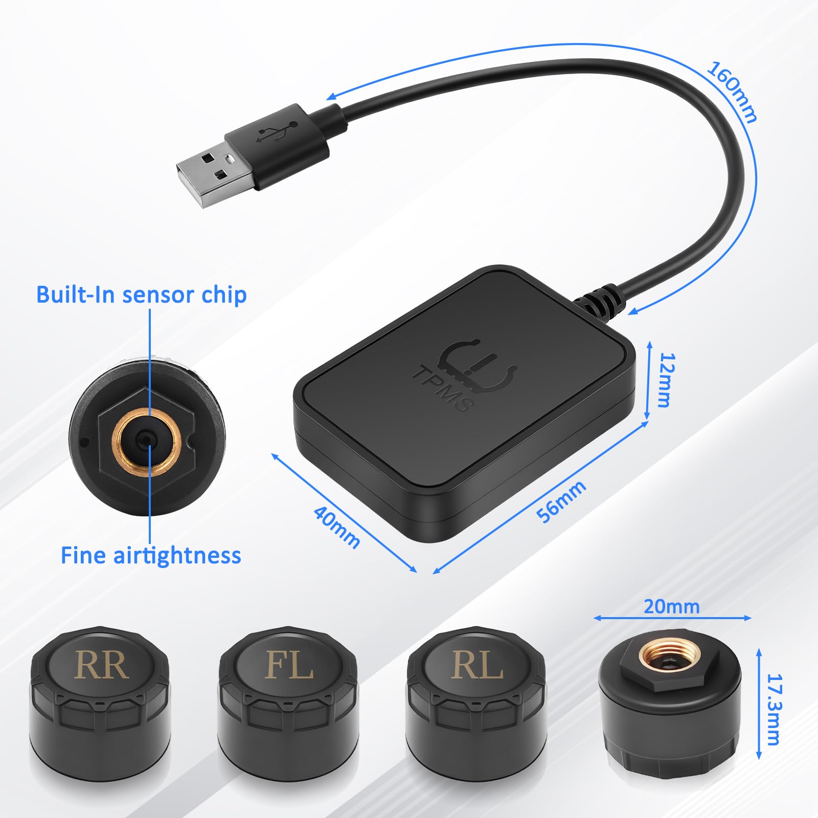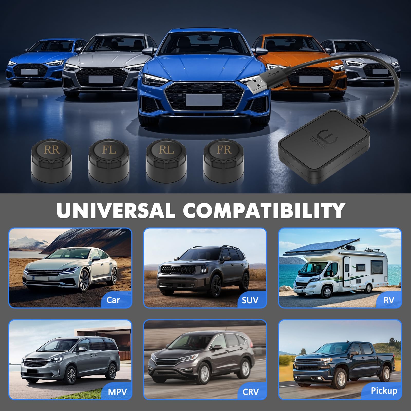 Military-grade Rugged Sensors: The USB TPMS is equipped with 4 IPX7 waterproof sensors (0-116 PSI) that can withstand temperatures from -30°C to 130°C and 50G shock.ABS+PC material screen is mud and rain resistant. Certified for off-road adventures. Easy to install and replace. Plug and play, no risk of damaging tires.Suitable for cars/caravans/trucks