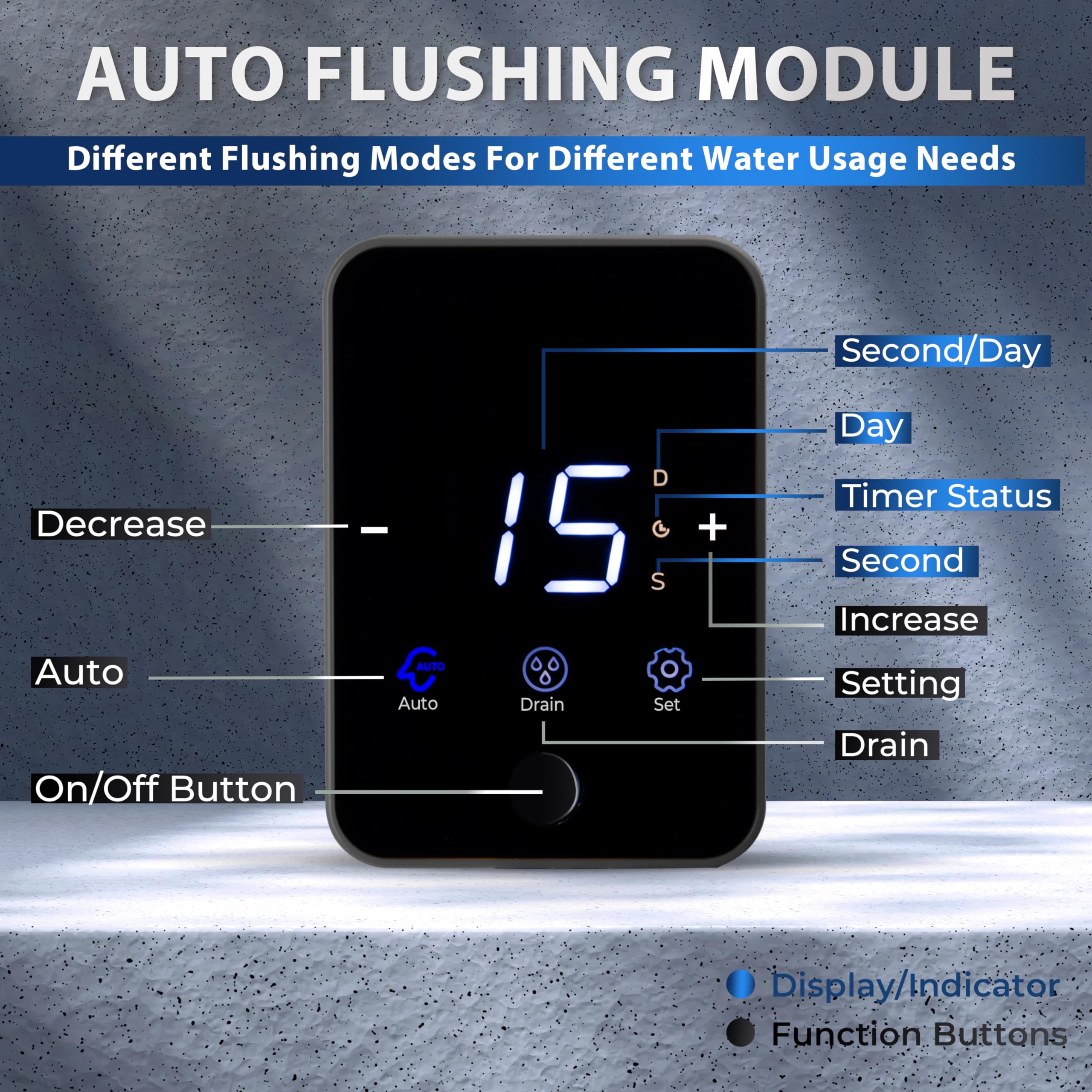 [Auto Flushing Module]The filter has an integrated auto-flushing module (dual power supply) that saves time on routine maintenance. Auto, semi-auto, and manual on the HD touchscreen are to enable the system to flush on a preset schedule automatically.
