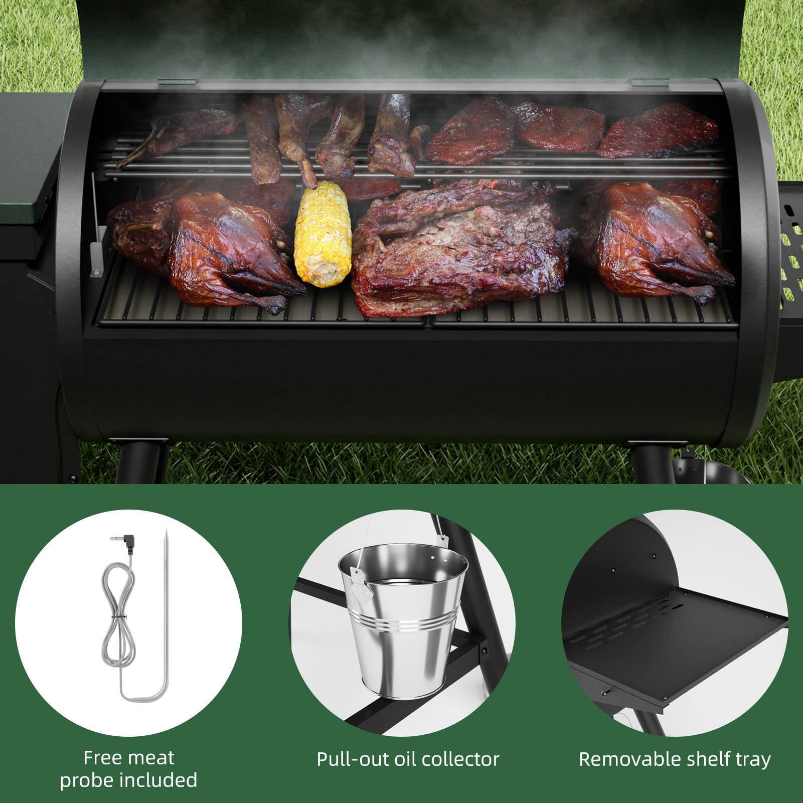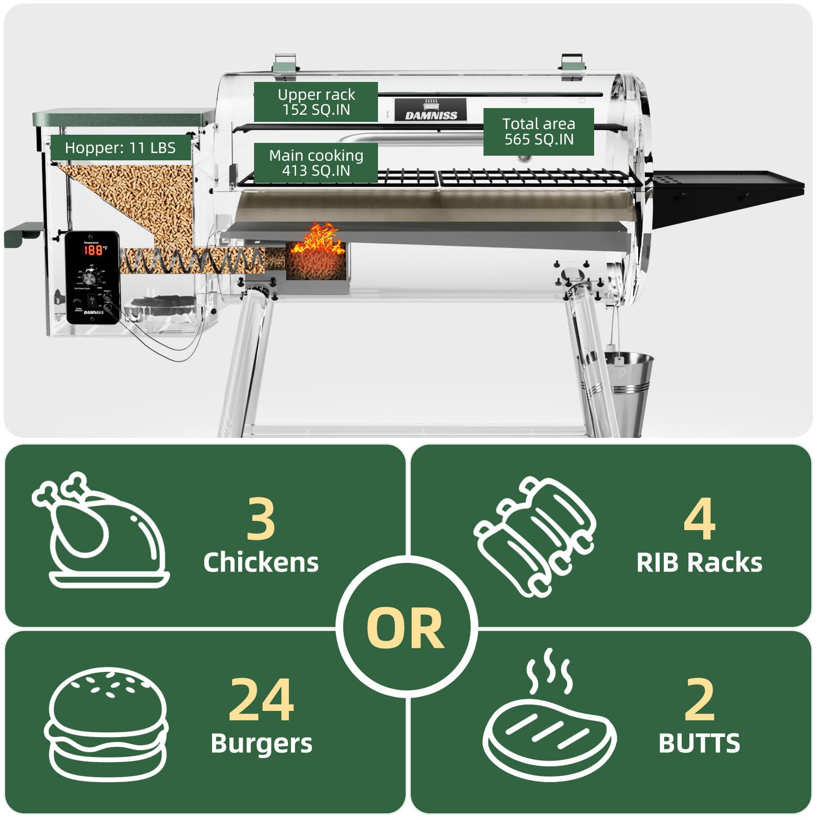 Perfect for Family Gatherings: With 565 sq. inches of grilling space and an 11-lb pellet hopper, this grill effortlessly handles large meals—cook 22 burgers, 4 racks of ribs, 3 whole chickens, or 2 pork butts at once. Includes a meat probe for foolproof, restaurant-quality results every time