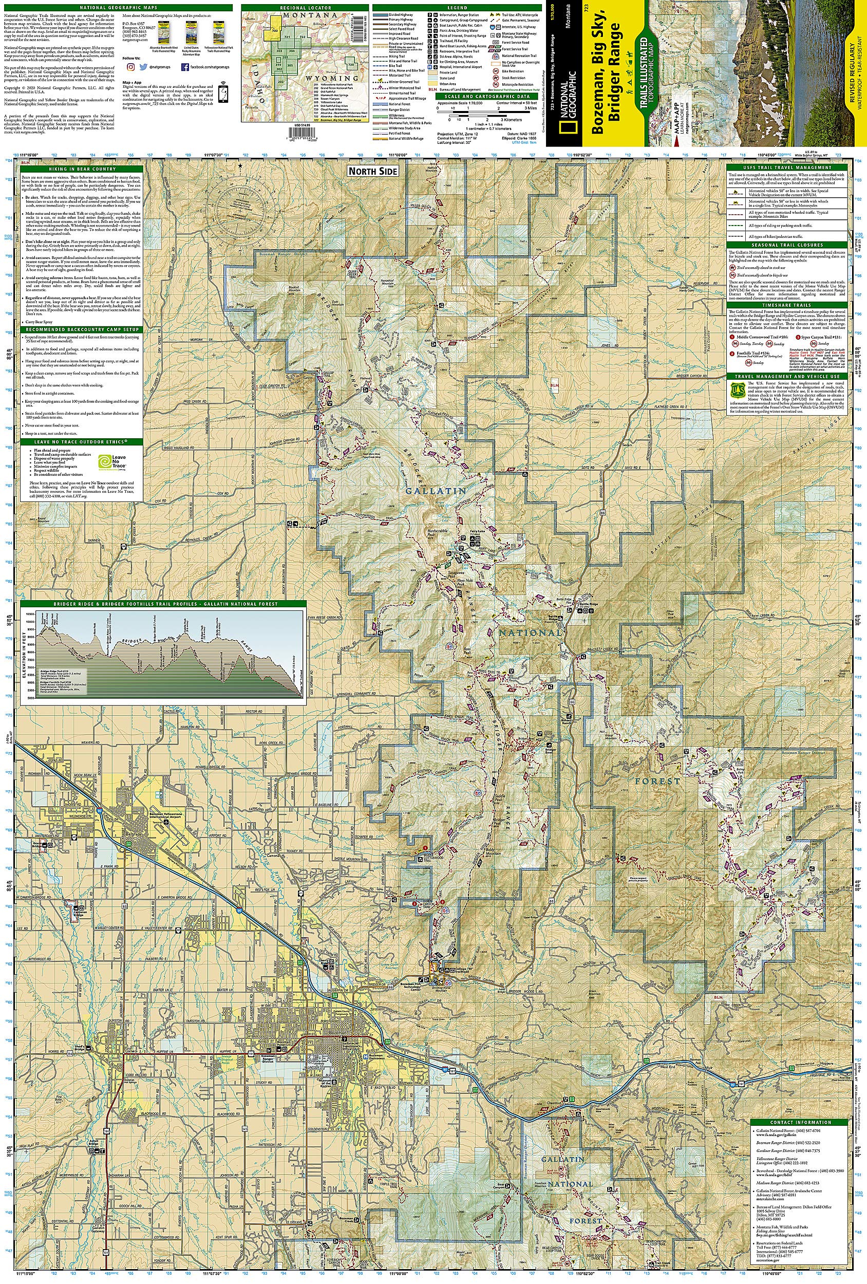 • Waterproof • Tear-Resistant • Topographic Map The Bridger and Gallatin ranges and their surrounding areas offer year-round recreation opportunities in a landscape of pristine forests, rivers, meadows, and soaring peaks. National Geographic's Trails Illustrated map of Bozeman, Big Sky, and Bridger Range is designed to meet the needs of outdoor enthusiasts by combining valuable information with unmatched detail of this inspiring region. Expertly researched and created in partnership with local land management agencies, this map covers many areas of interest including Gallatin National Forest, Lee Metcalf Wilderness, Hyalite Porcupine Buffalo Horn Wilderness Study Area, Hyalite Reservoir, Beaverhead-Deerlodge National Forest, Gallatin Petrified Forest, and portions of the Yellowstone and Gallatin rivers. With miles of mapped trails highlighted according to use, this map can guide you off the beaten path and back again in some of the most breathtaking scenery in the region. Trail mileage between intersections, and information on trail use, seasonal trail closures, and trail timesharing will assist you in choosing the path that's right for you. Additional safety tips, agency contact information, and handy Bridger Ridge and Bridger Foothills trail profiles are included as well. Recreation features are clearly marked, including campgrounds, trailheads, interpretive trails, fishing access, boat launches, ski areas, shooting ranges, and points of interest. The map base includes contour lines, shaded relief, and elevations for summits, passes and many lakes. Every Trails Illustrated map is printed on "Backcountry Tough" waterproof, tear-resistant paper. A full UTM grid is printed on the map to aid with GPS navigation. Other features found on this map include: Beaverhead National Forest, Blaze Mountain, Bozeman, Bridger Range, Gallatin National Forest, Hyalite Peak, Lee Metcalf Wilderness, Madison Range, Sacagawea Peak. Map Scale = 1:70,000 Sheet Size = 25.5" x 37.75" Folded Size = 4.25" x 9.25"