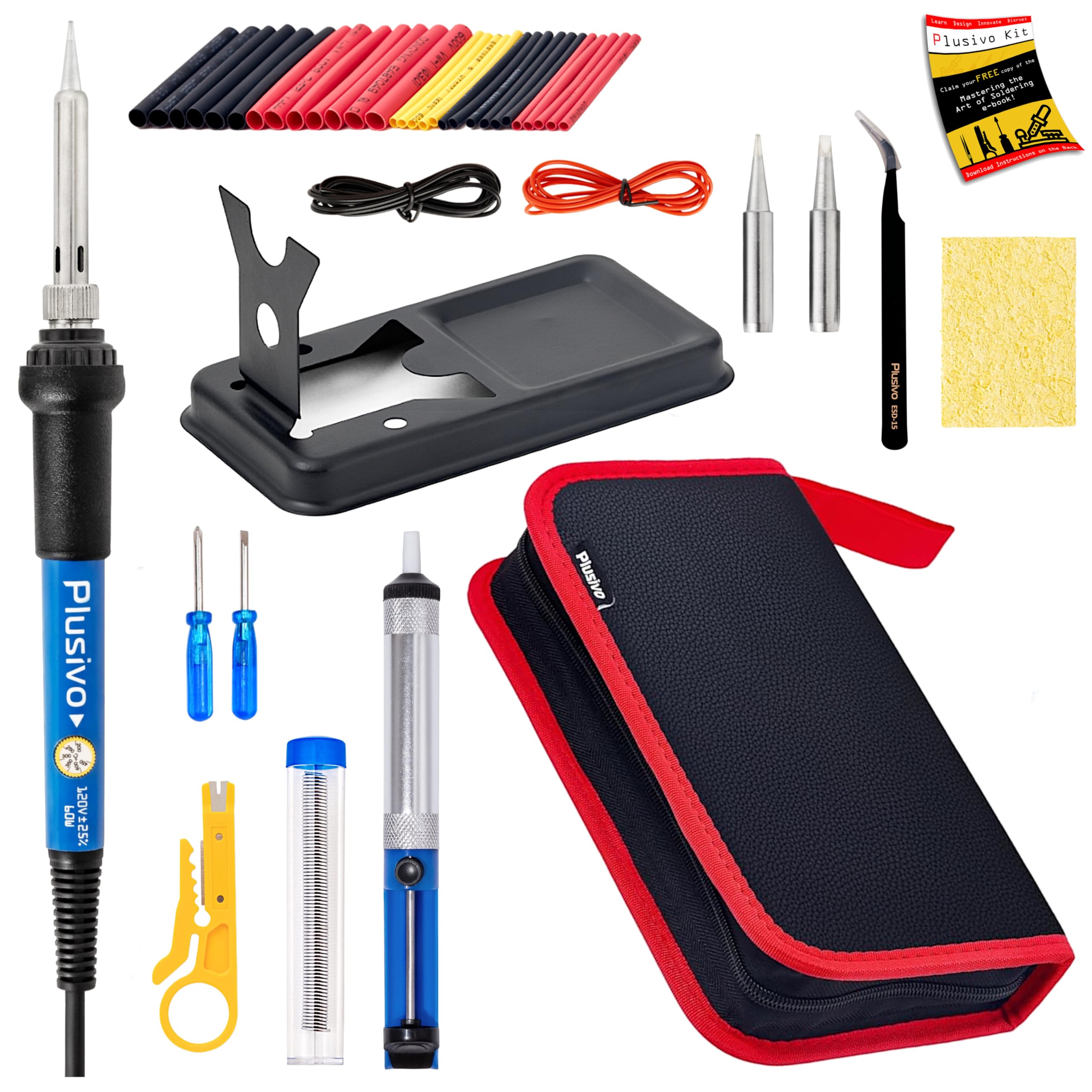 More than 14 items tools set with soldering iron, stand and sponge, 0.8mm solder wire, desoldering pump/solder sucker, 2pcs replaceable good quality soldering iron tips, tweezers, mini wire stripper, heat shrink tubes and ebook about soldering. Excellent for beginners, engineers training and professionals.