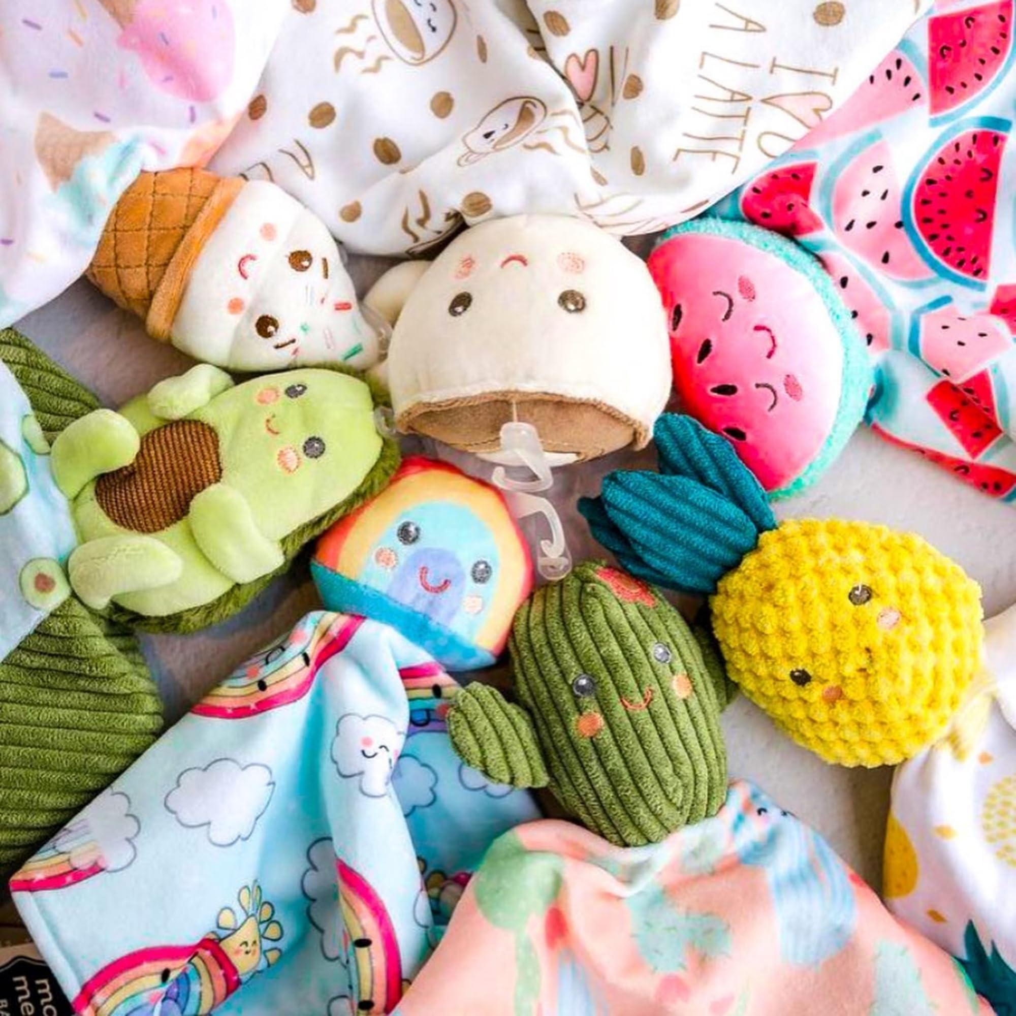 SWEET ICE CREAM: Soft toy on top is a vanilla ice cream cone with rosy cheeks, a sweet smile, and rainbow sprinkles, all embroidered for total softness