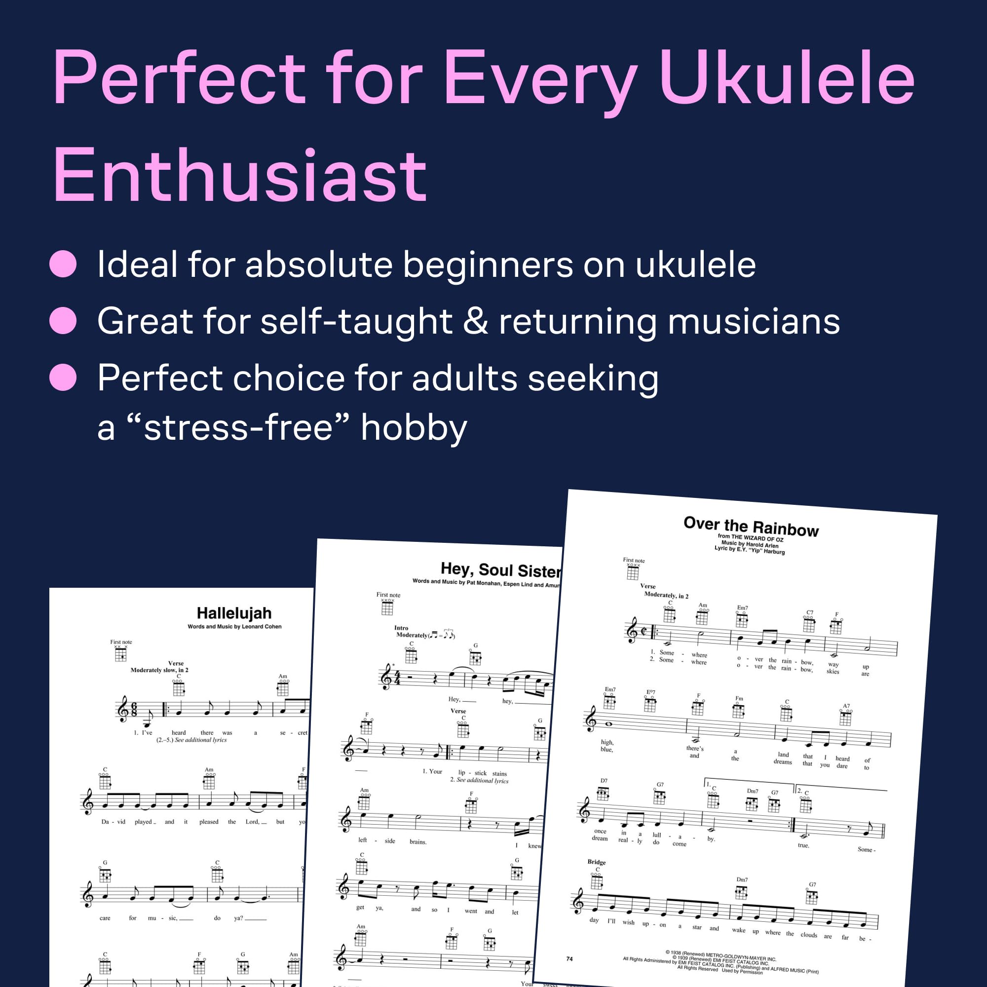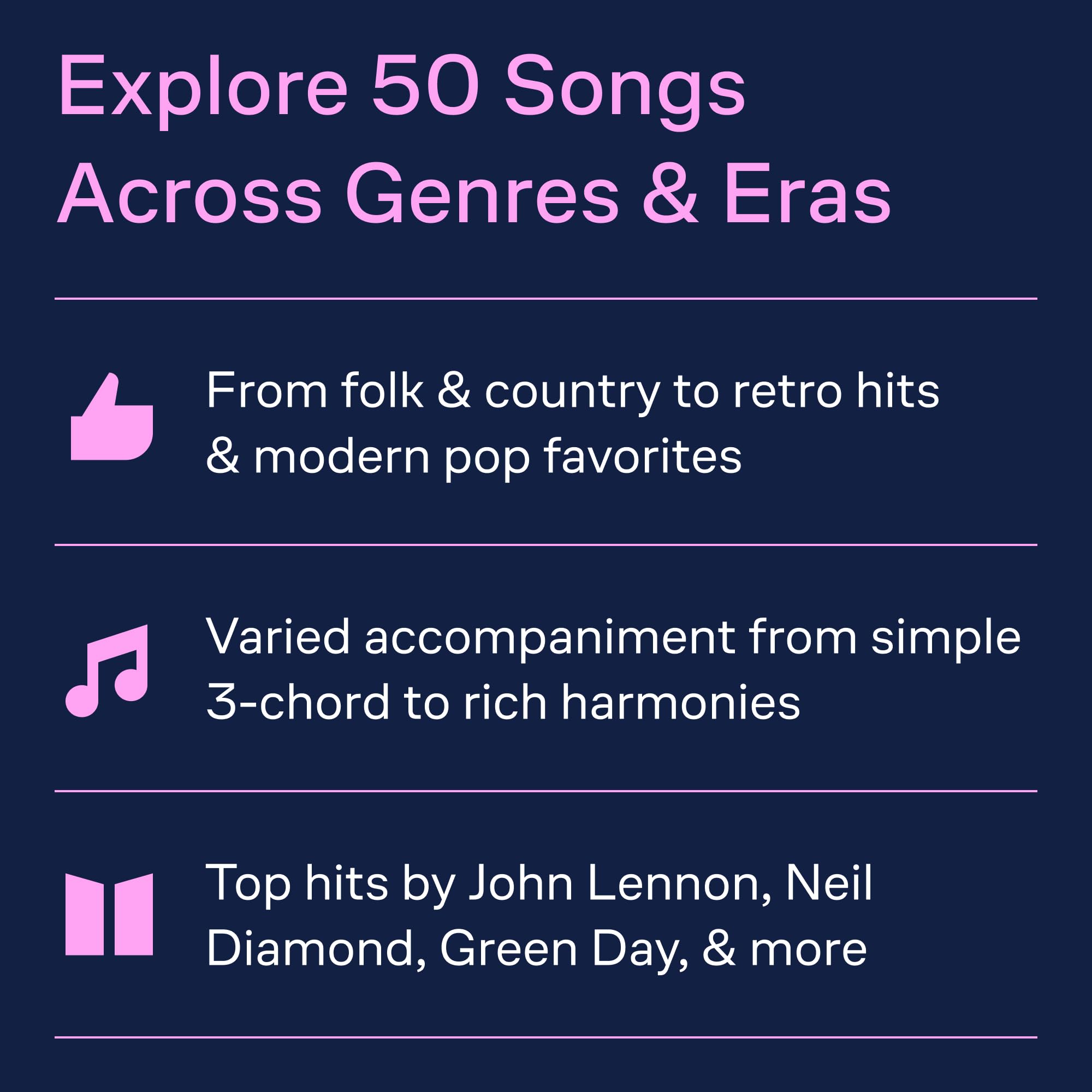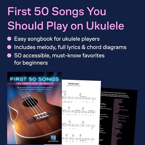 First 50 Songs You Should Play on Ukulele is the perfect starting point for beginners ready to move from basic chords to full songs. Designed for students, teachers, and adult learners, this ukulele songbook makes practice fun and rewarding. Ideal for home learning, lessons, or group sing-alongs, it helps new players gain confidence while playing familiar tunes. This collection includes 50 easy arrangements featuring melody lines, lyrics, and chord diagrams that make it simple to follow along. With 136 pages of well-known pop, folk, and classic songs, players can learn favorites such as “Hallelujah,” “Hey, Soul Sister,” “Imagine,” and “Take Me Home, Country Roads.” Each arrangement is designed for accessibility and enjoyment, helping musicians progress naturally and play with confidence. Whether used for self-teaching or in classrooms, this ukulele music book helps build confidence and technique through hands-on learning. The clear notation and chord guidance improve rhythm, reading, and performance skills, while familiar songs motivate consistent practice. It’s also an excellent music teacher resource and a thoughtful gift for ukulele players. Full Song List Afternoon Delight * Amazing Grace * Auld Lang Syne * Blowin’ In The Wind * Both Sides Now * Edelweiss * Hallelujah * Hey, Soul Sister * I Walk The Line * I’m Yours * Imagine * Mack The Knife * Over The Rainbow * Peaceful Easy Feeling * Puff The Magic Dragon * Rainbow Connection * Riptide * Singin’ In The Rain * Take Me Home, Country Roads * This Land Is Your Land * You Are My Sunshine * and many more. Bring music to life. Perfect for lessons, practice, or casual play, this book inspires every ukulele player to grow, perform, and enjoy the joy of making music every day.