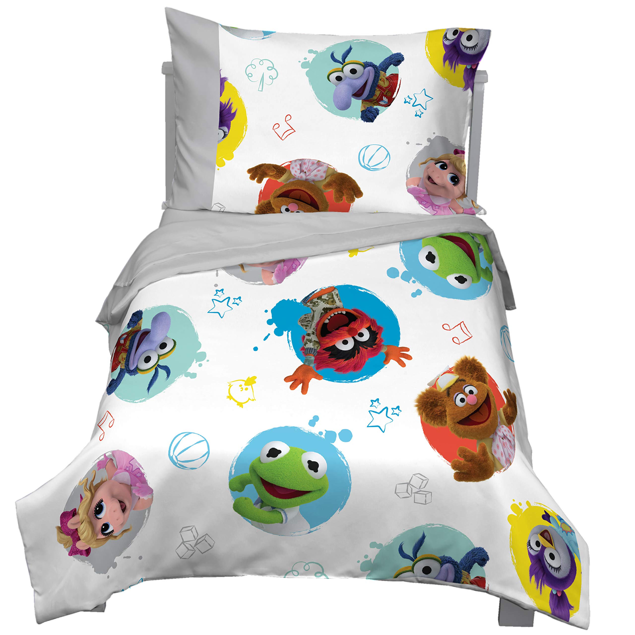 Muppet Babies - Friendship 4 piece Toddler Bed Set includes a 42 x 57" comforter, 20 x 30" reversible standard size pillow case, fitted bottom sheet 28 x 52 x 8", and flat top sheet 60 x 45". All fabrics are a soft cozy 100% polyester microfiber.