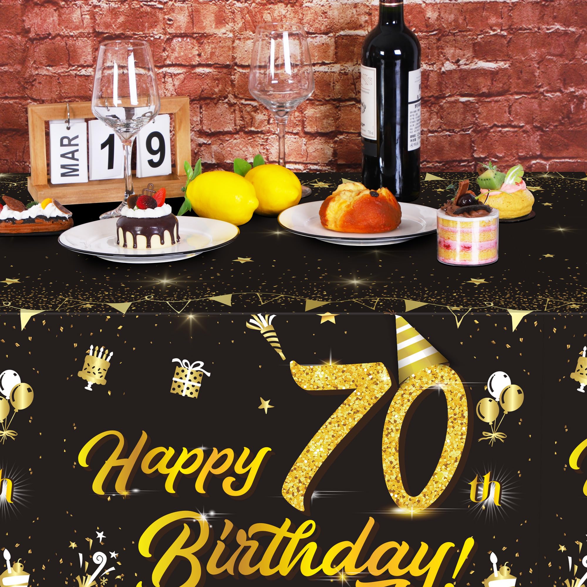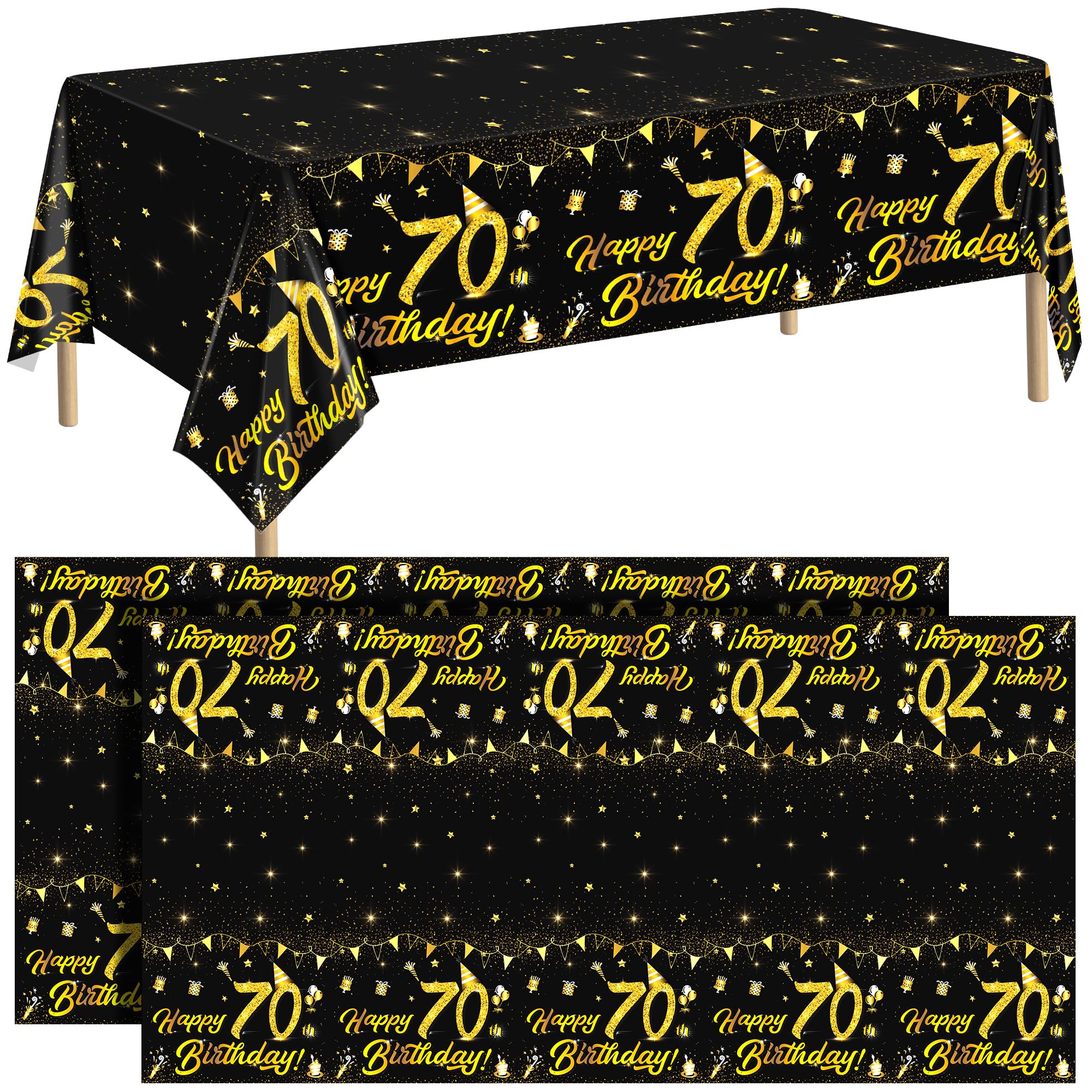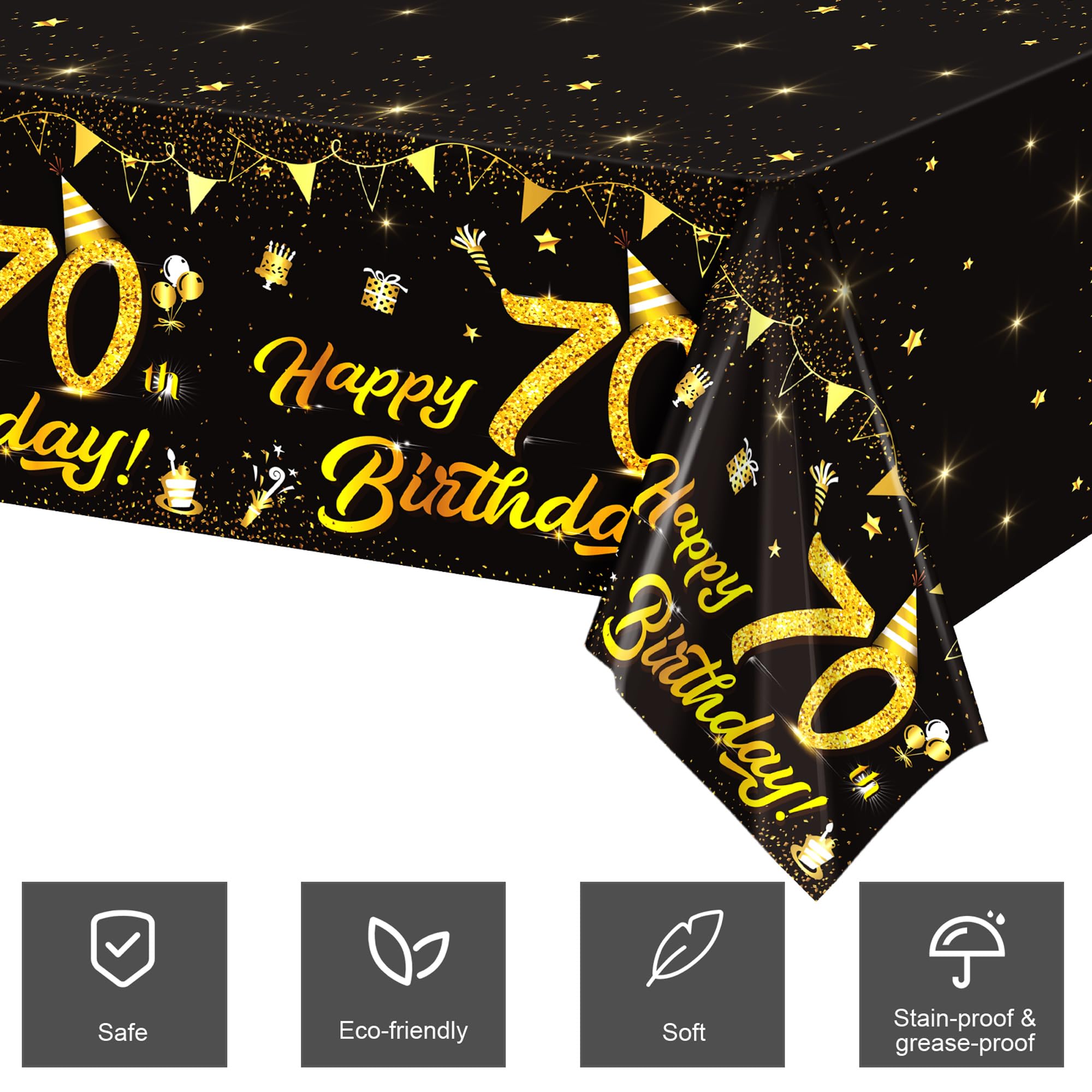 Special design: our plastic party tablecloths are designed with gradient gold words "Happy 70th Birthday", which are evenly printed on the black background of two sides, beautiful and magnificent; with rich elements like cute gift box, Christmas hat, cake, candle and fireworks, these tablecloths will add elegant festive atmosphere