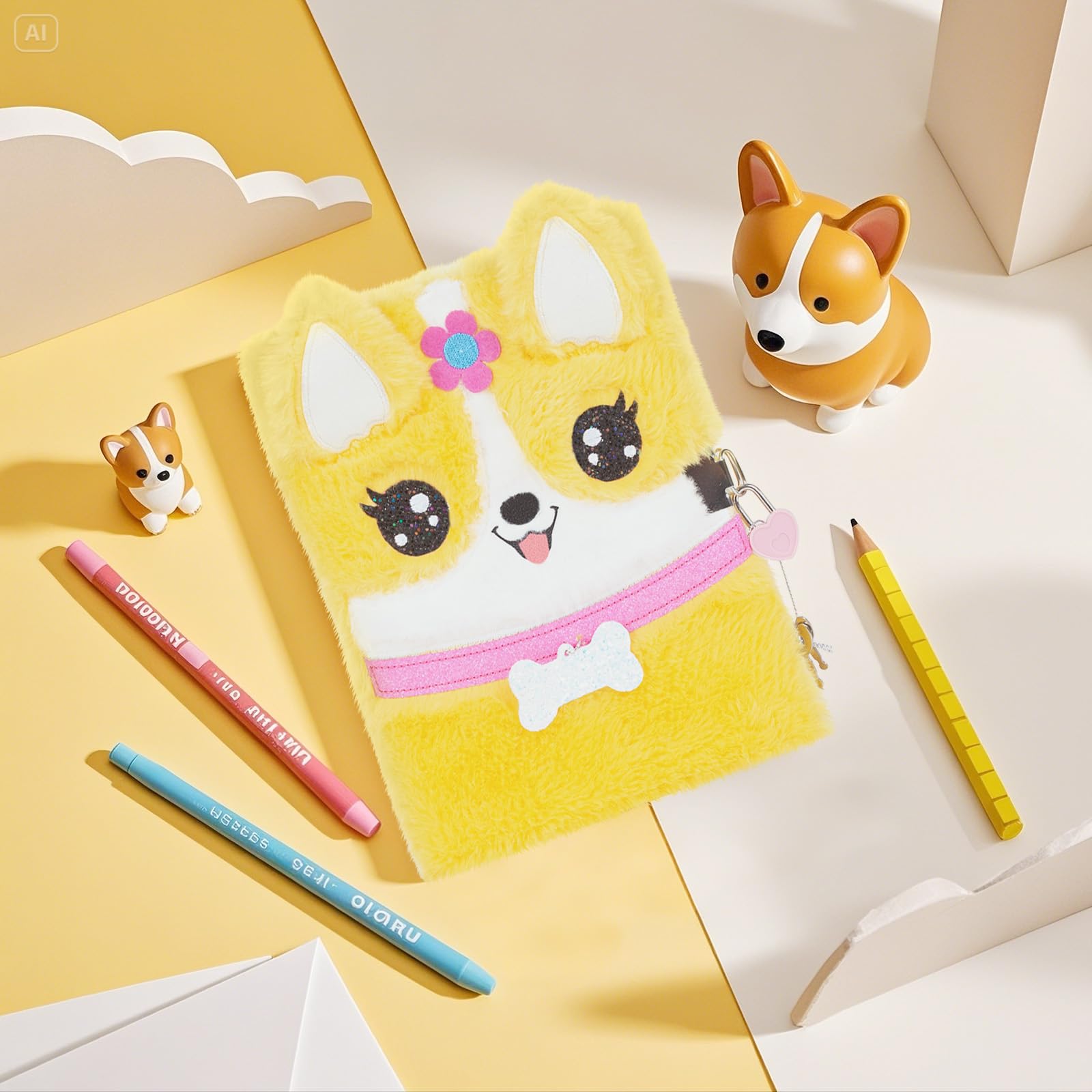 Creative Cute Cartoon Corgi Diary: Lovely corgi, 3D modeling, nerdy face, kids favorite; Plush diary, soft furry feel, with exquisite embroidery, so cute, a magical notebook, which can bring a lot of fun for kids