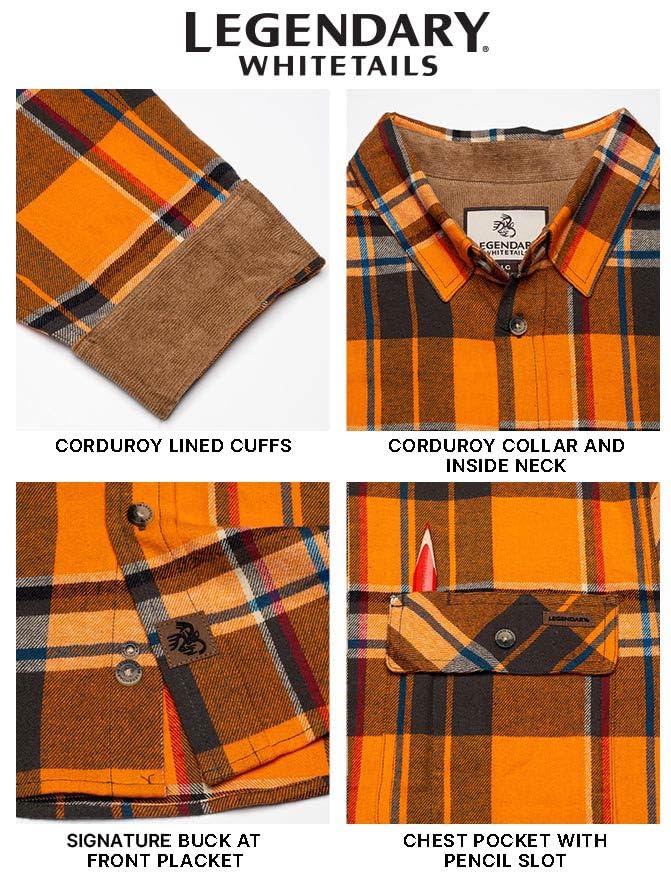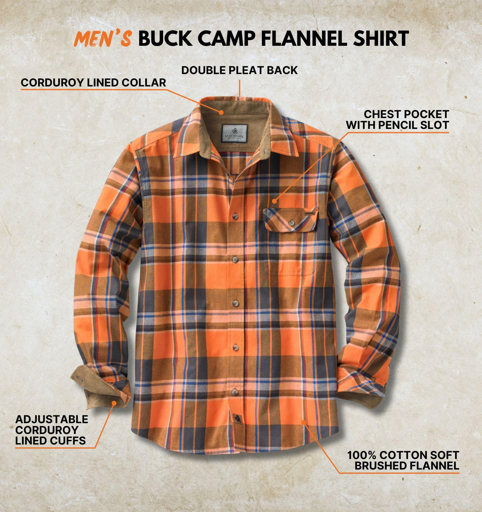 Description Our original single pocket flannel - The Buck Camp Flannel Shirt is the perfect weight to wear alone or layered over a t-shirt or under a shirt jacket. The traditional style and signature corduroy details offer unmatched durability, while the relaxed fit and brushed cotton flannel provide ultimate comfort. With multiple exclusive plaids and solids, they're suitable for any occasion from the woods to the office. The Buck Camp Flannel Shirt gives you an incredible "bang for your buck"! Big & Tall sizes are designed for men over 6'2" and add 2" in body length and 1-1⁄2" in sleeve length.