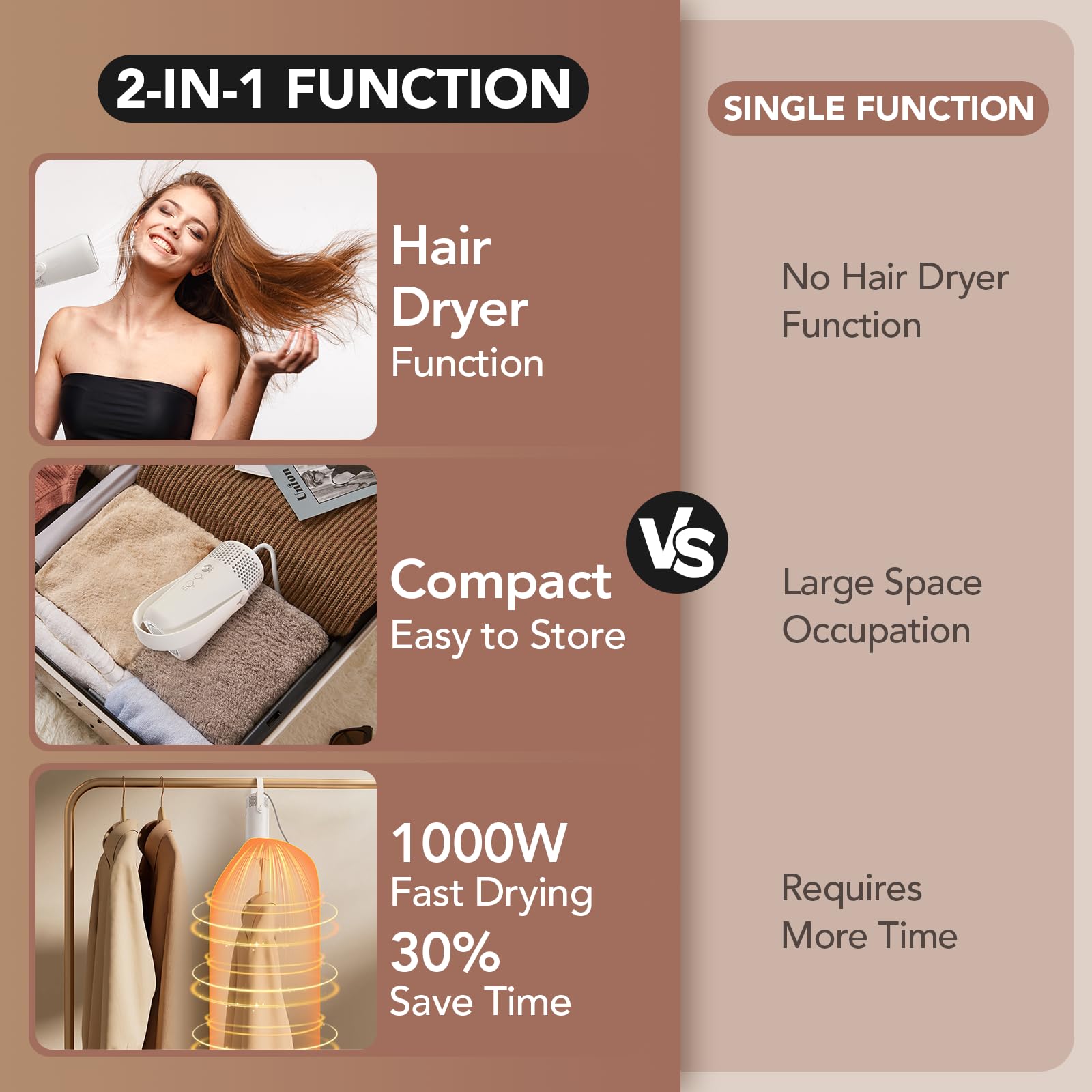 2-in-1 Clothes & Hair Dryer: Switch easily between a dedicated clothes dryer and a gentle hair dryer. This dual-function mini dryer offers versatile use for your laundry and hair drying, making it a practical all-in-one travel companion for students and travelers