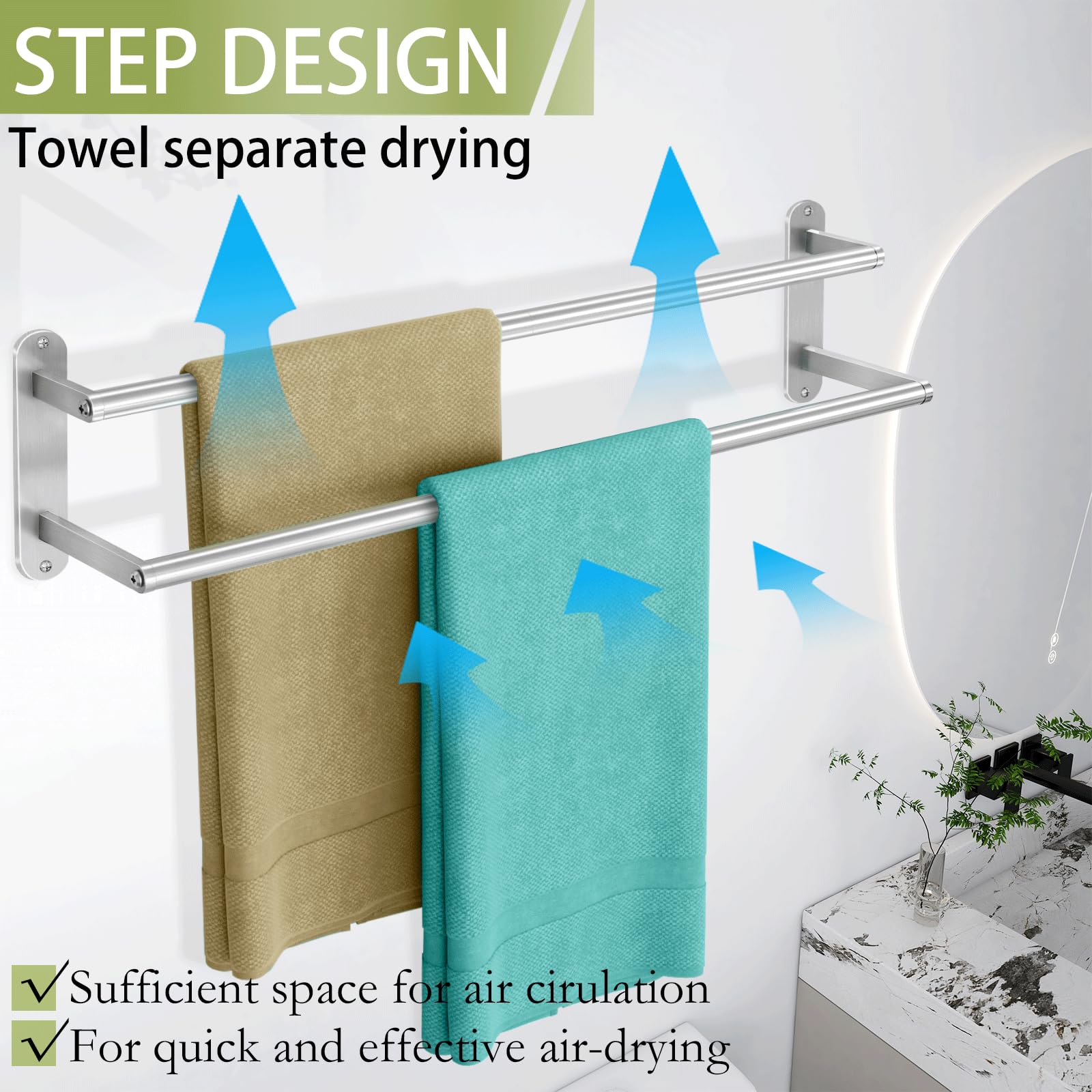 STEP DESIGN - Staggered high and low bars with enough distance space between the two bars for easy access to towels and faster towel drying. The towel rack for bathroom maximizes space and stores twice as much space