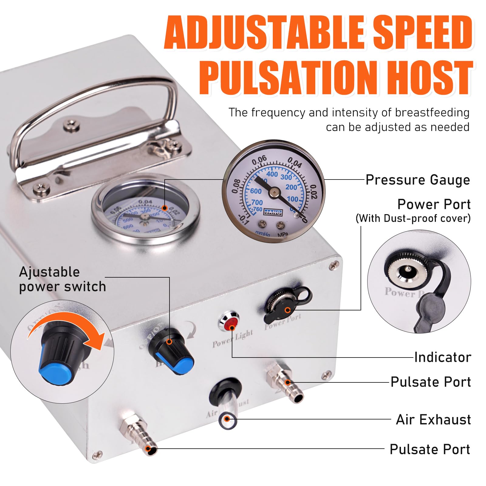 Portable and durable vacuum pump: Aluminum housing helps dissipate heat, the Pulsation Vacuum Milker comes with a power adapter that allows you to recharge the pump on the go for long-lasting operation, and the quick-release design of the main internal parts allows for easy replacement, thus extending the life of the milking machine