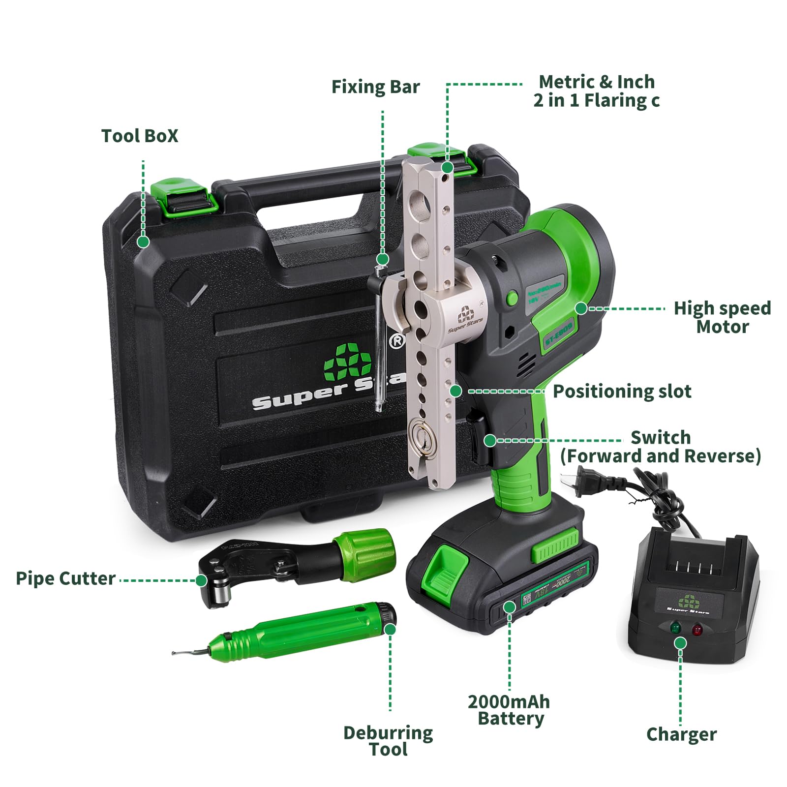 Super Stars Power Flaring Tool Kit Cordless, 1/4"–3/4" HVAC Copper Pipe Flare Tool with 45° Eccentric Cone, Metric & SAE Clamps, Deburring & Cutter Tools