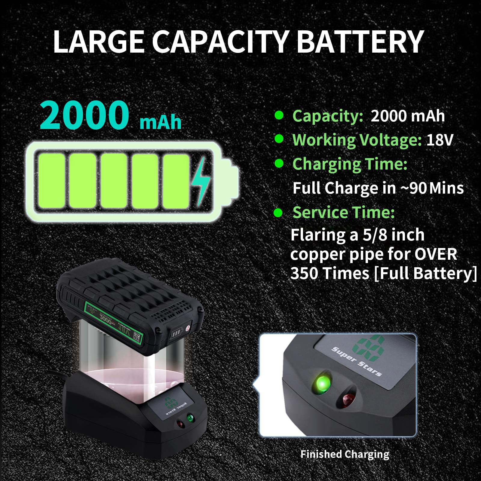 High-Capacity 2000 mAh Battery: 18V lithium battery fully charges in approximately 90 minutes; flares a 5/8" copper pipe up to 200 times per charge