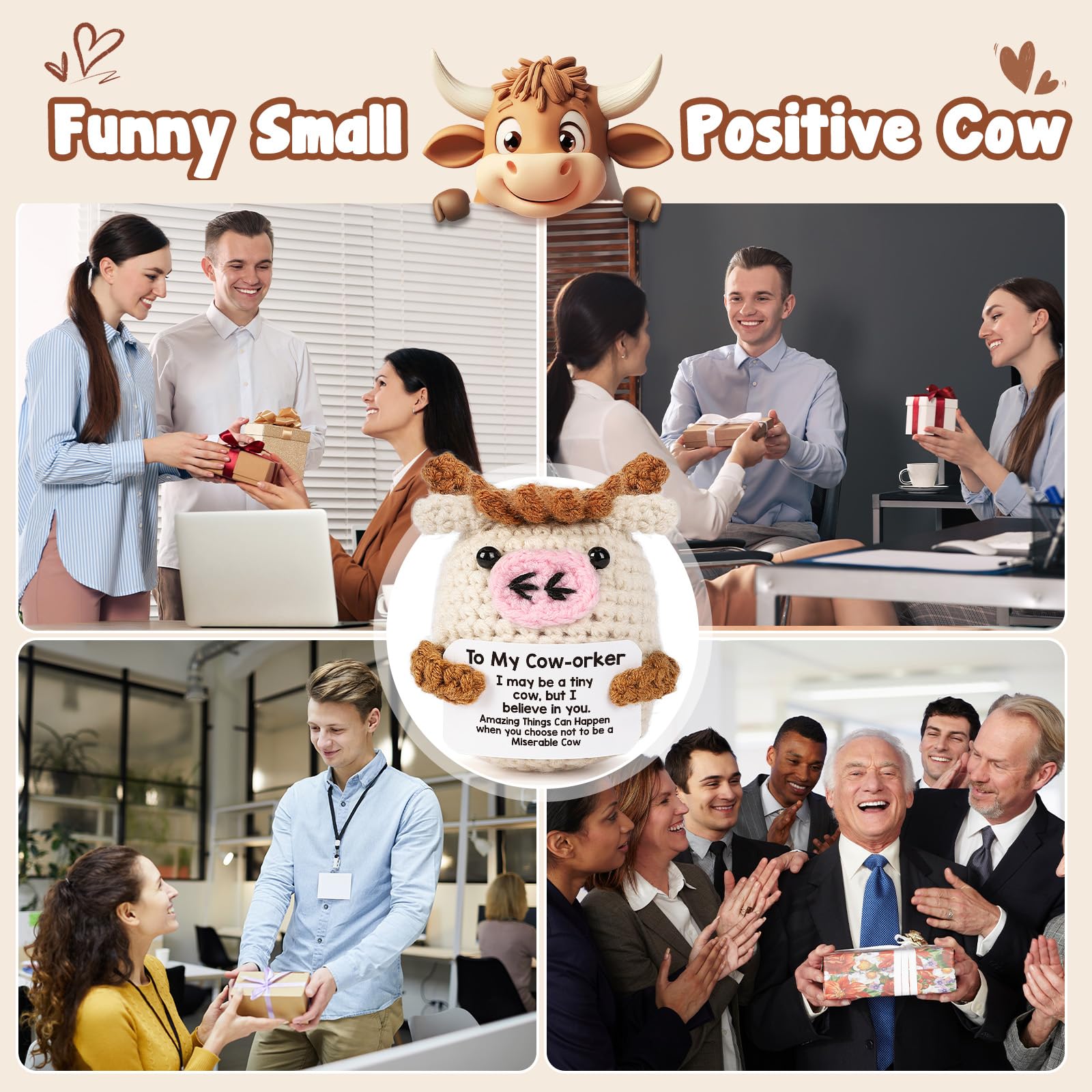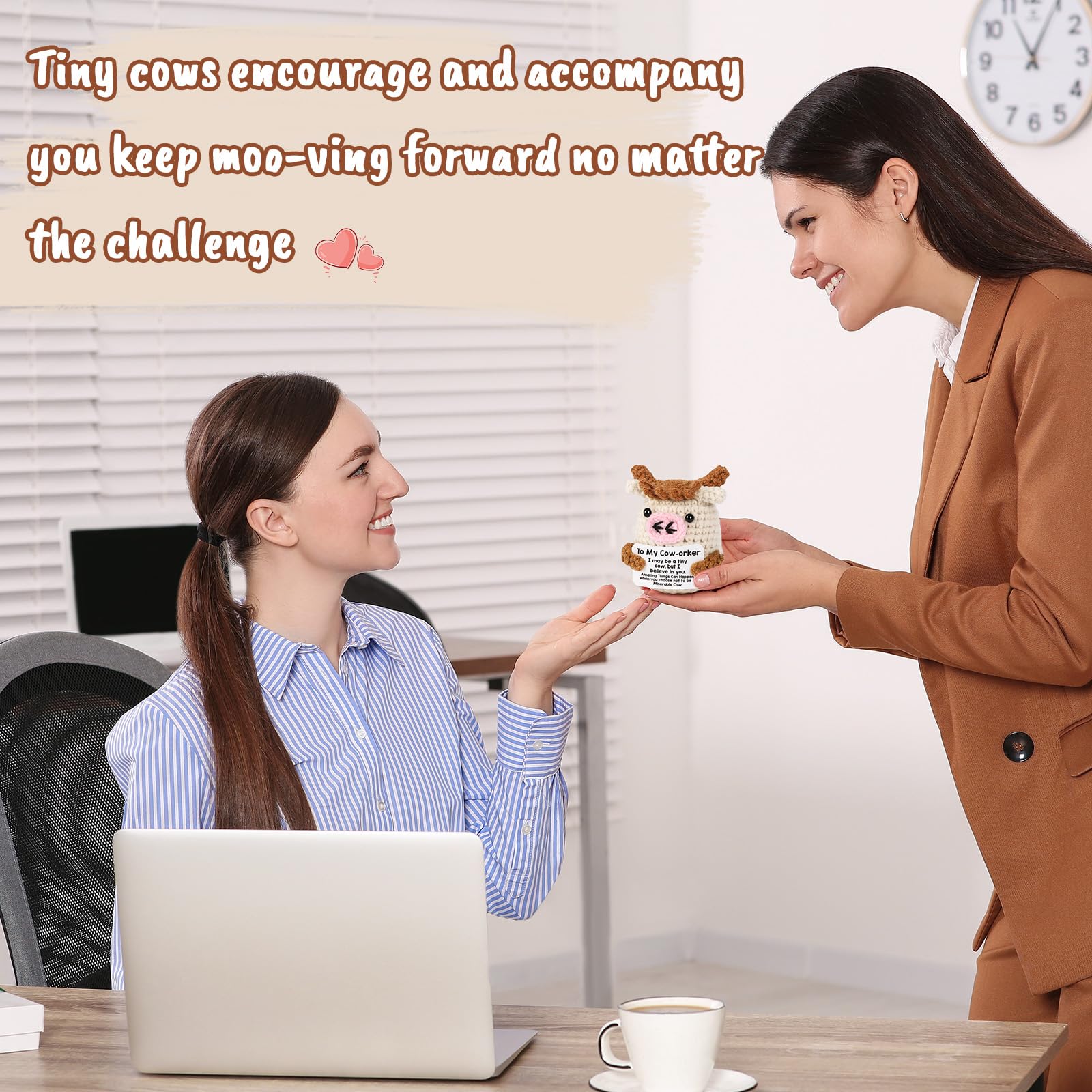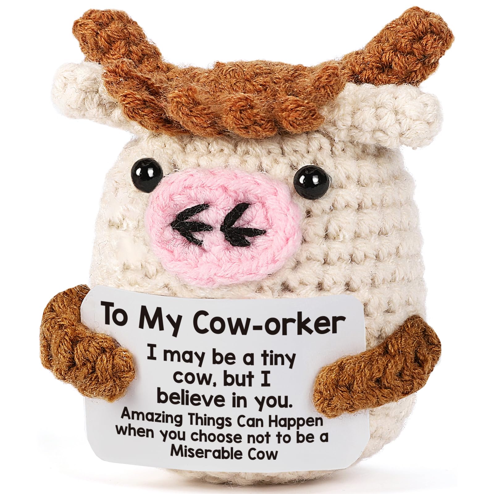 Appreciation gifts for coworkers: This handmade knitted cow doll with its playful message, “to my coworker i may be a tiny cow, but i believe in you amazing things can happen when you choose not to be a miserable cow” is more than just a cute cow doll, is the perfect way to express love special