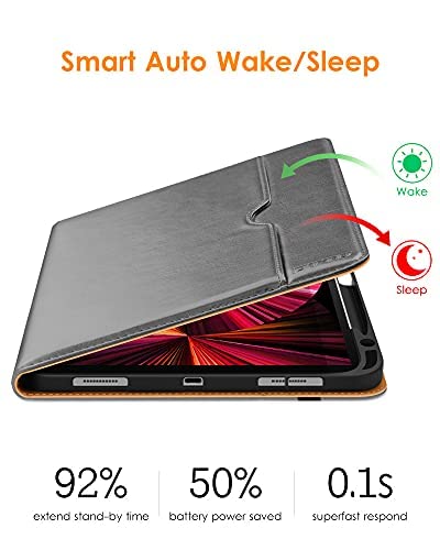 Front cover have Auto Wakes/Sleep function, external elastic band enhances magnetic closure (reduces battery drain).