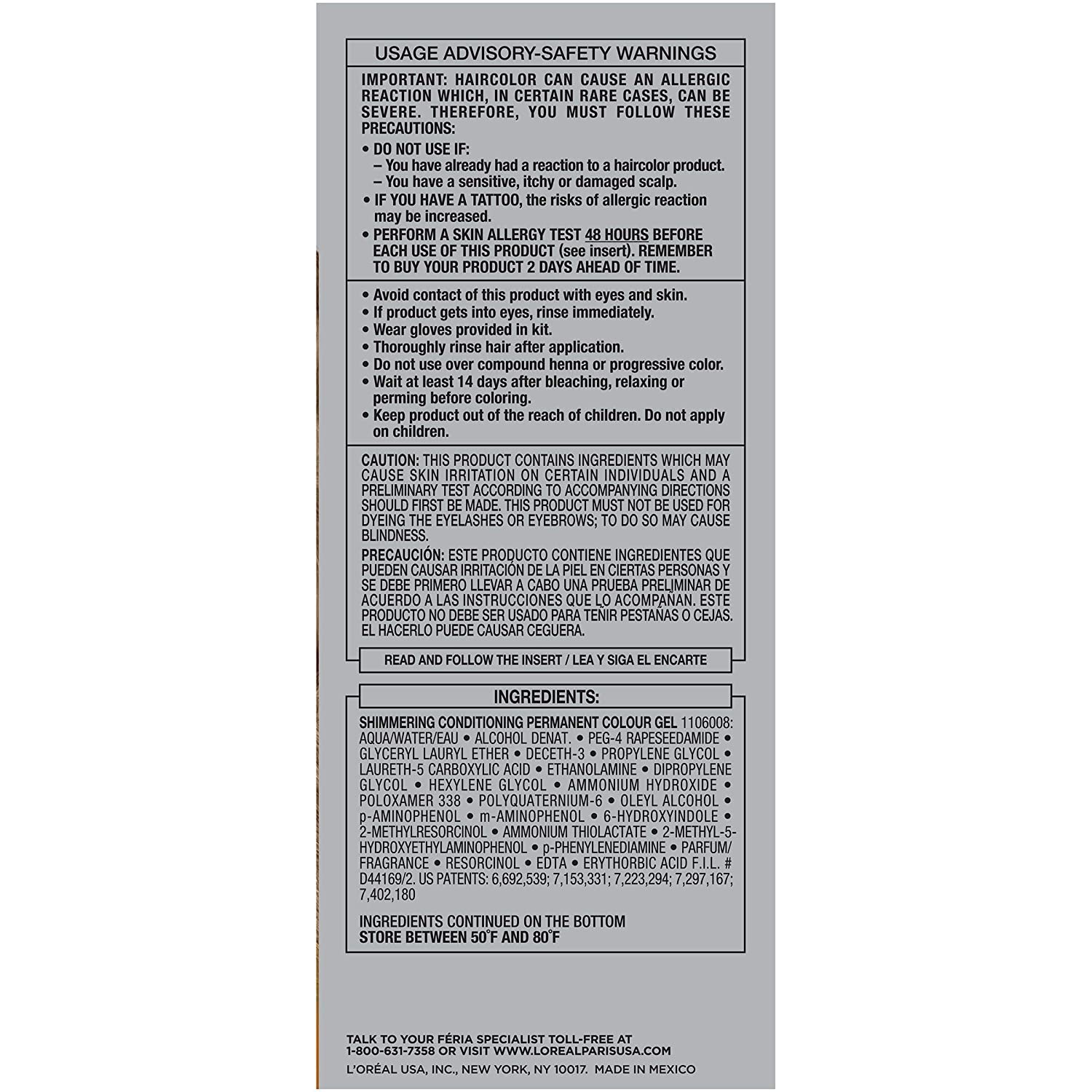 With L'Oreal Feria, what you see is the shimmer. Multi-Faceted shimmering color with 3X highlights delivers intensified, brilliant results. Inspired by fashion, Feria offers a twist on the traditional and gives edgy hair color - from bright red, platinum blonde, rose gold, metallic brown, to blue black hair color, these hair dye kits will transform your hair. Feria's prismatic color spectrum is custom-blended by L'Oreal master colorists for bold, head-turning shades - no appointment necessary. The Power Shimmer Conditioner seals and smooths. Won't wreck or ravage hair. Packaging may vary, what you receive may not be what is reflected on site.