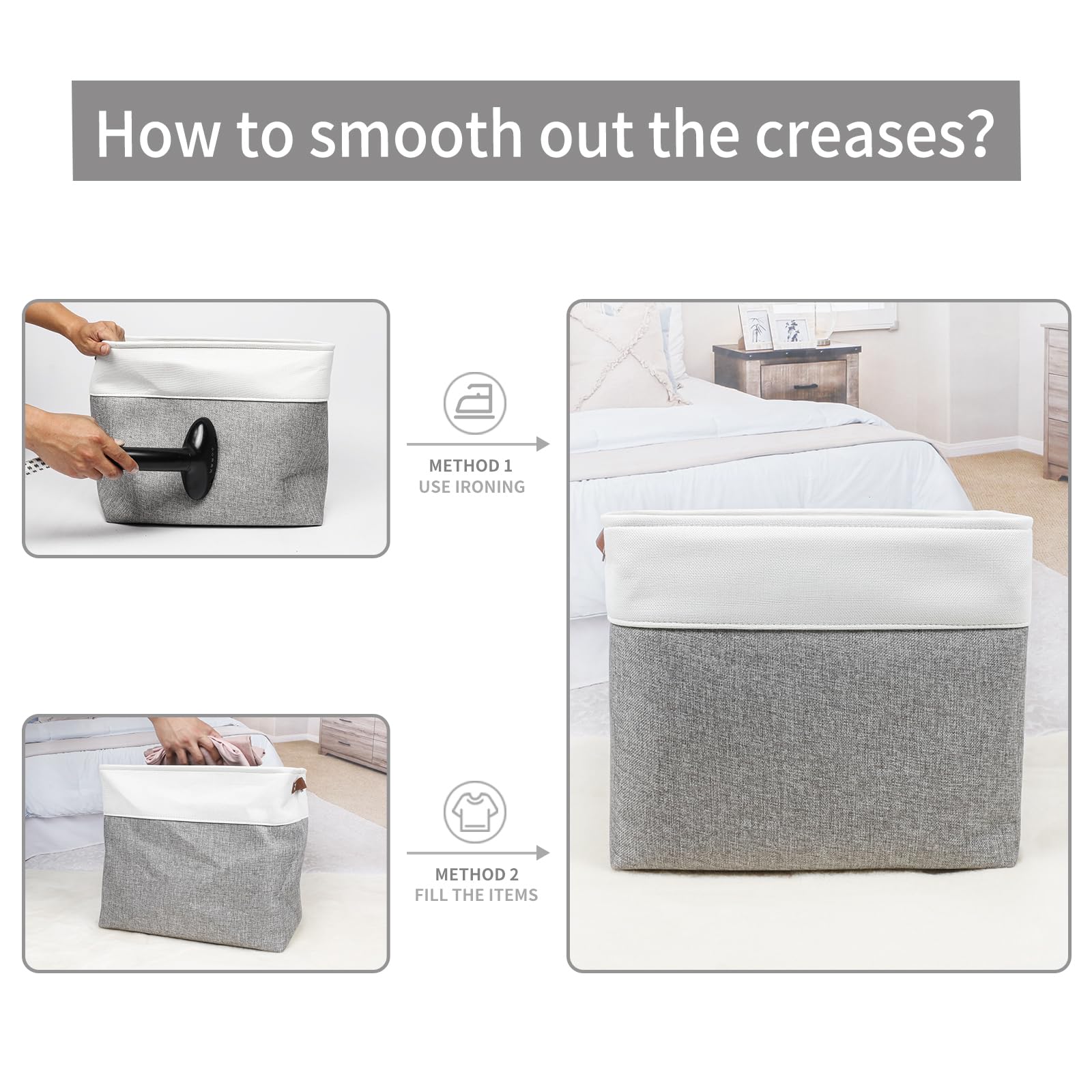 【Maintenance & Care Tip】 - Collapsible design for space saving. Our foldable baskets comes in a compression packing which may result in wrinkled storage bin during the long transit. Get rid of the wrinkles by either stuffing the fabric storage bins with blankets and pillows for a few days or steam iron them at low-heat setting. The organization baskets are easy to clean, you can dust the basket with a soft cloth with light soapy water when needed.