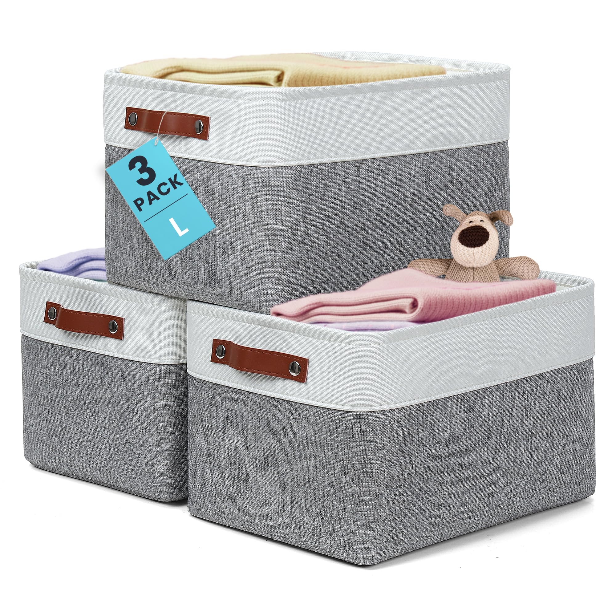 【Extra Large Storage Bin】- Set of 3 decorative storage baskets, dimensions (each): 17” (L) x 12” (W) x 15” (H) / (43.2cm x 30.5 cm x 38 cm). Its huge capacity can keep your home nice and tidy. Minimalist design and neutral color can be integrated into any home decorations and styles. Sturdy fabric baskets add a stylish touch to a living room, bedroom, office, kitchen or personal space.