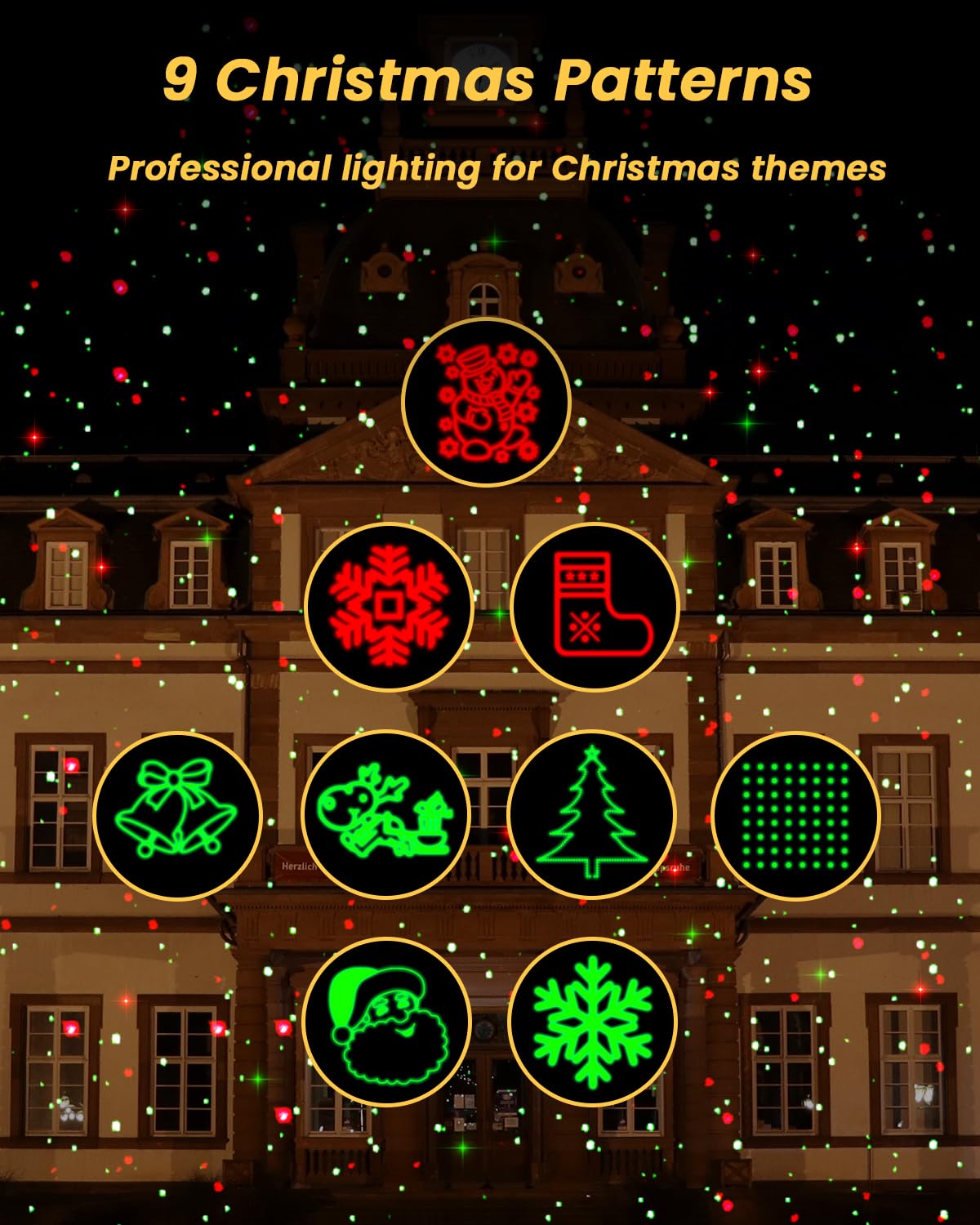 【Upgraded 9 Patterns】Christmas laser projector light with festive motifs projects red and green laser lights onto walls, ceilings, and lawns for a perfect Christmas, holiday entertainment, parties, and landscape decoration. It including stockings, snowflakes, Jingle bells, Christmas trees, Santa Claus, reindeer, snowmen and moving firefly