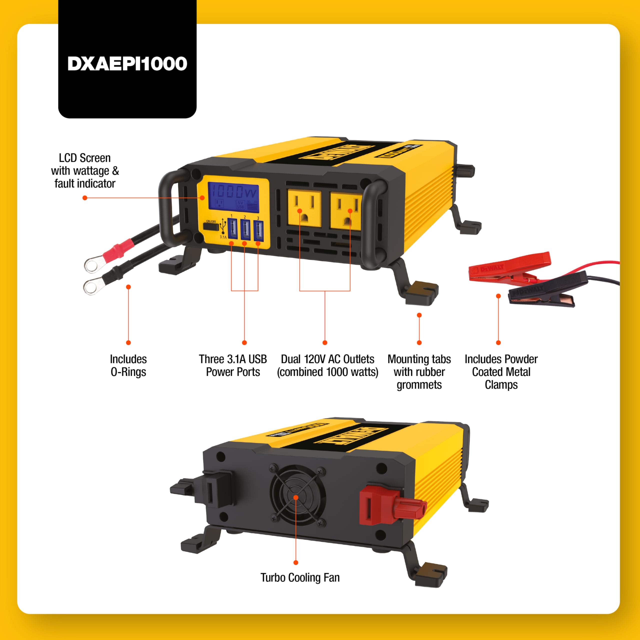 The DEWALT DXAEPI1000 power inverter delivers 1000 Watt of practical household power you can transport using dual 120 volt AC outlets and 3 3.1 Amp USB charging ports. Features an LCD screen showing real-time information on the status of power consumption, battery status, and any fault issues. Slim aluminum housing and integrated grommets for easy mounting and installation; battery connectors and mounting hardware included. The DEWALT DXAEPI1000 power inverter includes a limited 1 year manufacturer warranty.