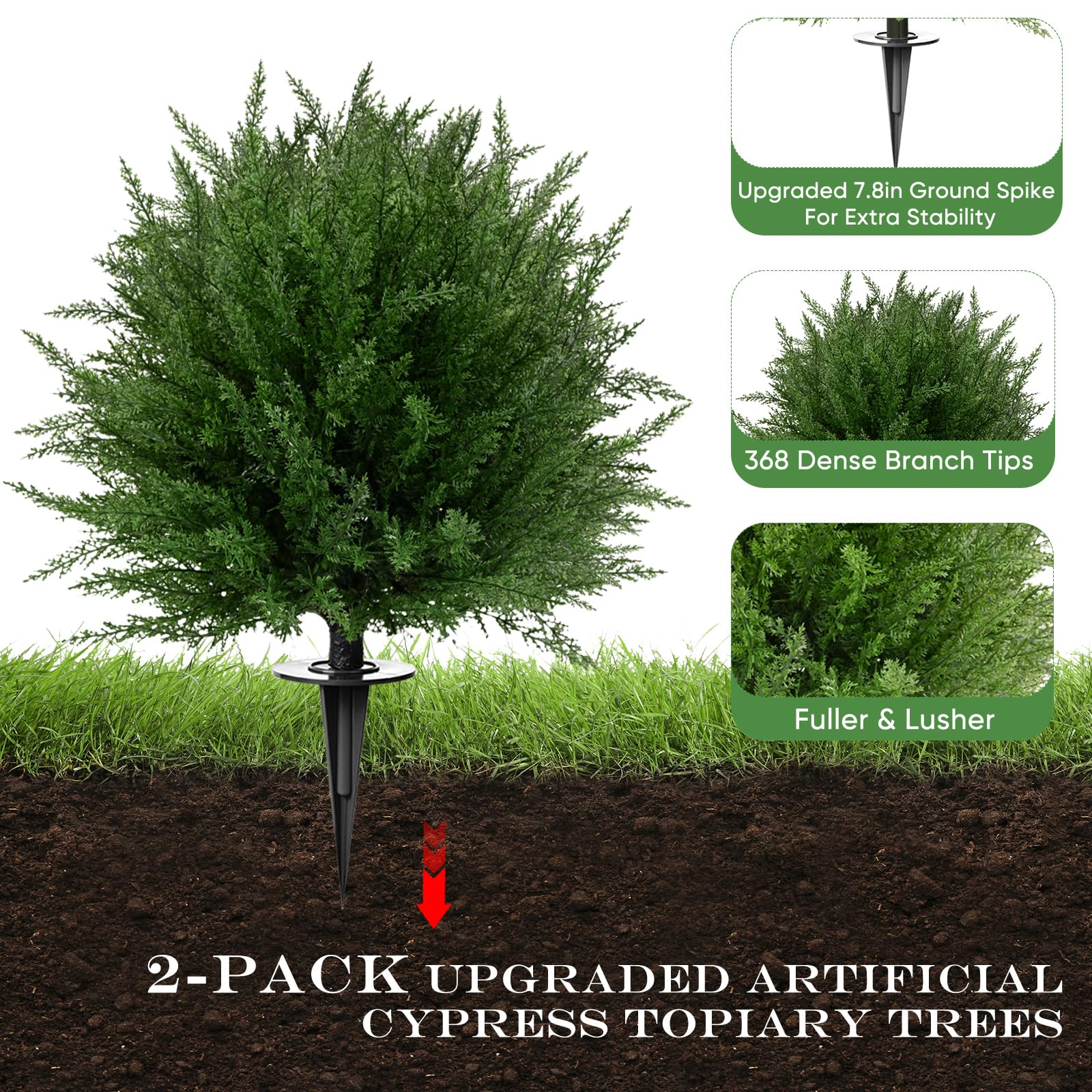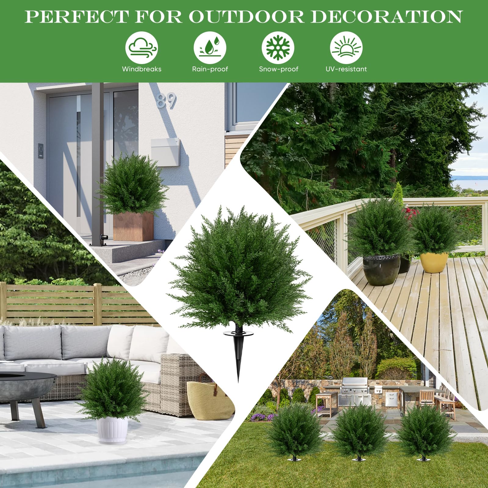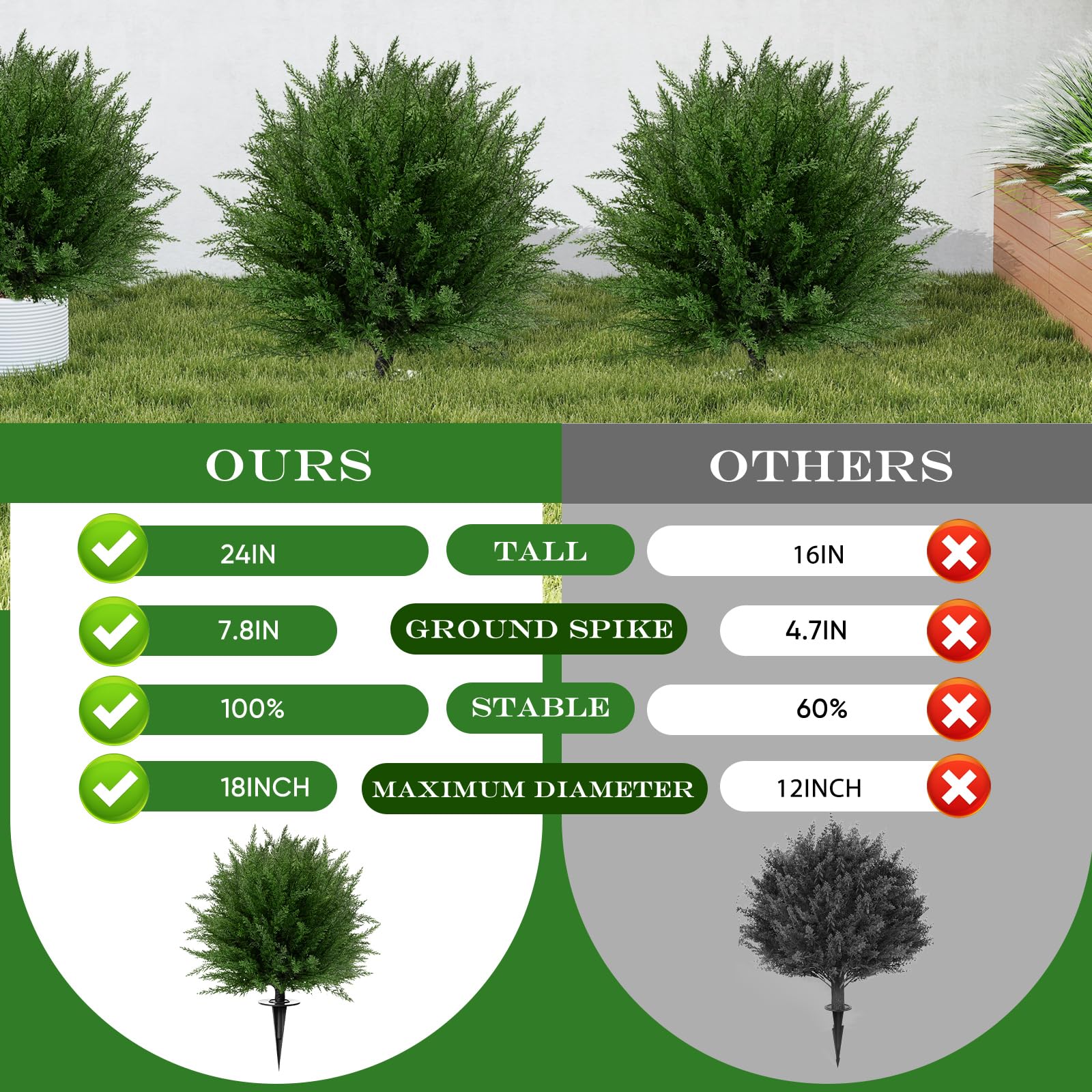 【Upgraded Deep Spike – Stronger Hold in Any Weather】Now featuring a newly upgraded 7.8-inch tapered spike, our artificial shrubs stay firmly anchored in soil, planters, or gravel—even in strong wind or heavy rain. The conical design ensures a secure, weather-resistant hold, making these faux bushes perfect for any outdoor setting, all year long.