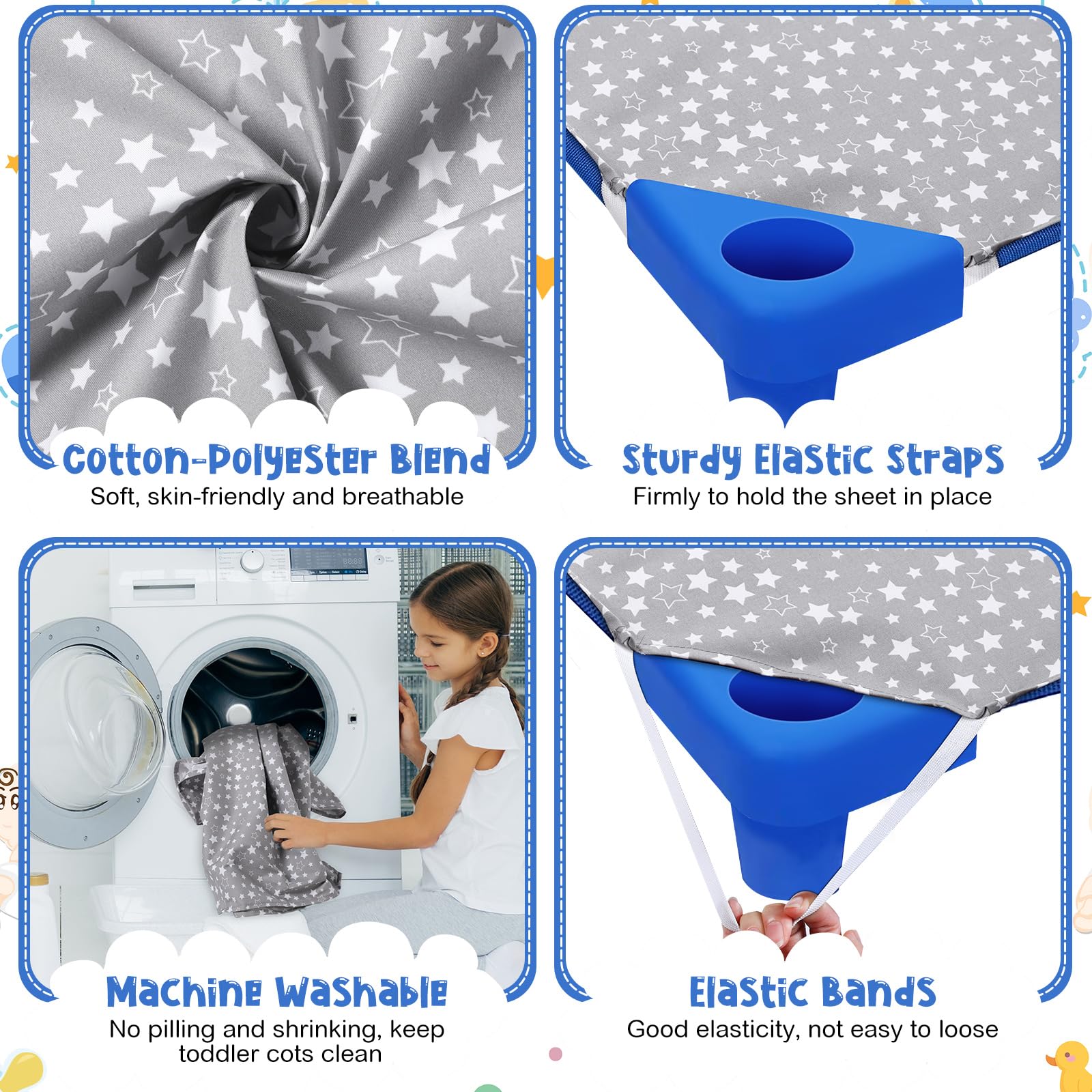 Elastic Straps Design: each cot sheet for daycare is designed with 4 elastic bands, making it easy to install on the crib mattress and keep the sheet firmly in place during naptime; A feature that makes the sheet safer for babies