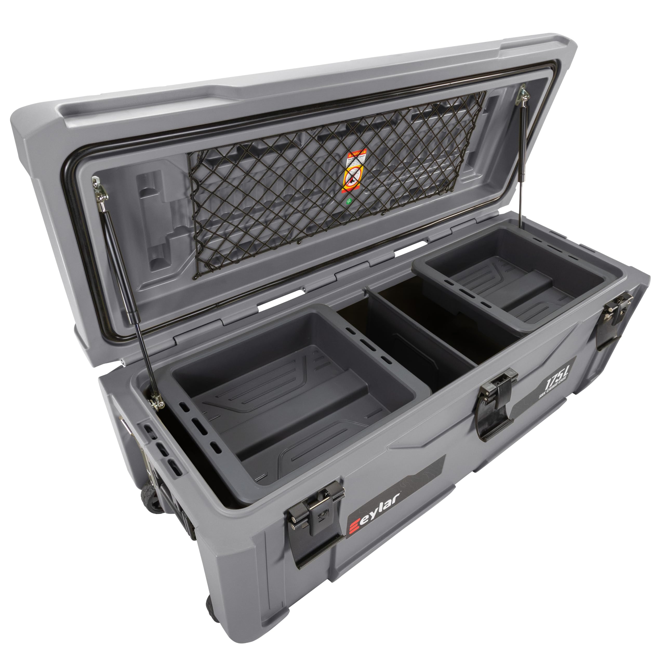 The Eylar SRX-175 Extra Large Offroad Transport Cargo Case is built for those who demand maximum durability and versatility in their outdoor adventures. With an expansive 175-liter capacity, this rugged case is designed to protect your gear in the harshest conditions, whether you’re tackling rough trails, setting up camp in the wild, or transporting essentials on an extended road trip. Its reinforced construction and lockable latches keep your equipment secure, while the rubber gasket lining ensures waterproof protection to shield your contents from the elements. The gas strut lid provides effortless opening and stays propped up for easy access, making packing and unpacking a breeze. Perfect for multi-purpose storage, the SRX-175 is ideal not only for tools and camping gear but also for food and dry goods storage. The included internal tray and divider help keep everything organized, from cookware and provisions to essential supplies. The built-in drain system allows for quick and easy cleaning, making it perfect for use as an impromptu cooler when filled with ice. Plus, dual bottle openers offer added convenience for unwinding after a long day of adventure. For enhanced safety and organization, the SRX-175 includes optional reflective stickers, improving visibility in low-light conditions. Its stackable design allows for efficient storage on a vehicle roof rack, in a truck bed, or in a garage—ensuring stability without the risk of cases shifting. Whether you're heading off the beaten path, gearing up for a weekend tailgate, or just in need of a reliable, all-weather transport case, the Eylar SRX-175 Extra Large Offroad Transport Cargo Case is built to go wherever the journey takes you.